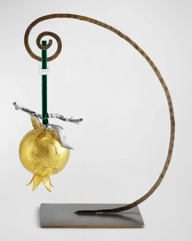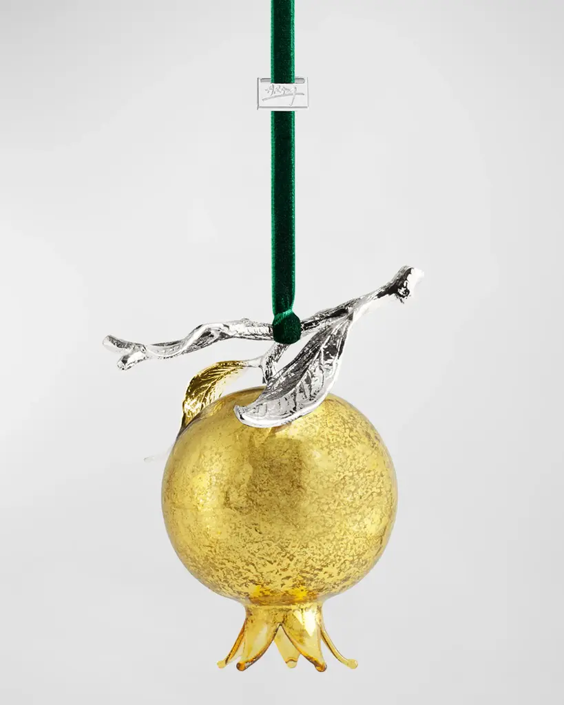 The Michael Aram Pomegranate Collection takes its inspiration from one of the most universal and ancient symbols in the world. The fruit has been prized across the globe, across cultures and across time as a representation of life, rebirth, and renewal as well as fertility and union. Ornament handcrafted of goldtone and silvertone metal and glass Approx. 5.3"Dia. x 6"T Item Weight (Lbs.): 0.5 Imported About Michael Aram: American artist Michael Aram studied art in New York in the late 1980s before traveling to India on an inspirational journey, where he discovered a rich metalworking tradition that inspired his turn toward handcrafted design. Michael Aram established a home and workshop in New Delhi, where he began crafting objects ranging from tableware to furniture, all of which reflect the hand of the artisan. The tension of line, form, and meaning is a distinguishing characteristic of Aram's extraordinary designs, inspiring thoughtful appreciation and bringing a sense of ceremony in their day-to-day use. Each Michael Aram piece is handmade, so no two items are exactly alike.