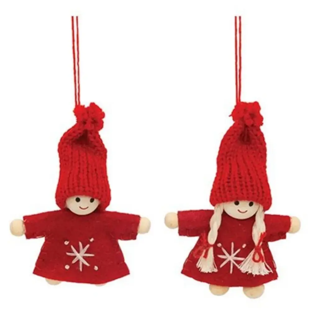 Specifications:Description: The Mini Winter Scarf Doll Ornaments are an assortment of two decorative wooden doll figurines made with gray felt material. One doll has straw braids, and both dolls have smiling faces and wear striped scarves with red felt hats. The ornaments include red string hangers to use for display, bringing a charming Nordic touch to a Christmas tree during the holiday season. Each doll measures 2.5” high by 1” in diameter.