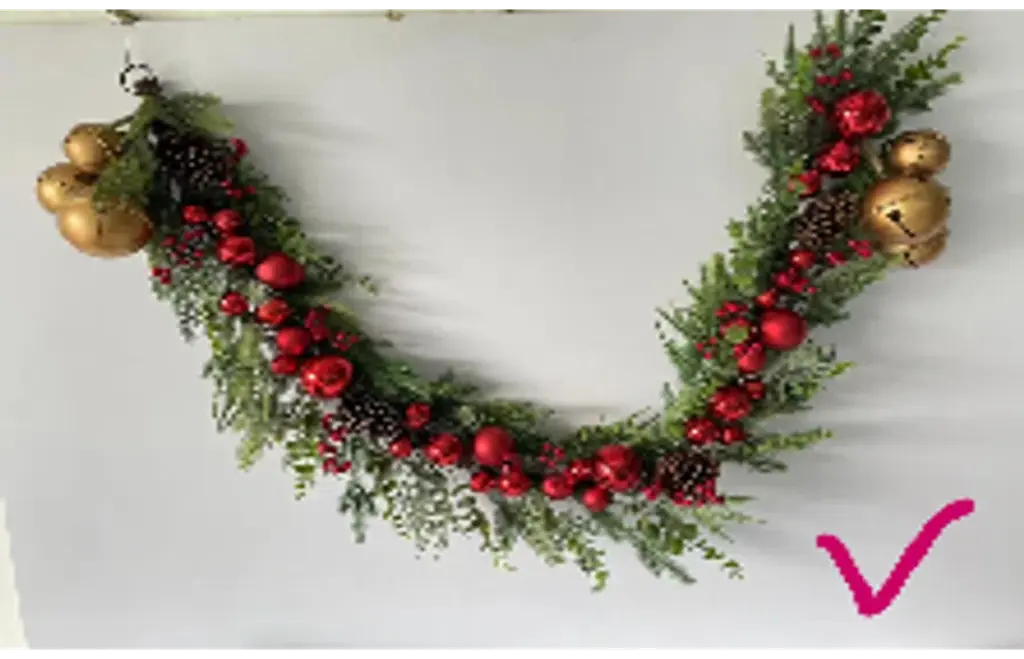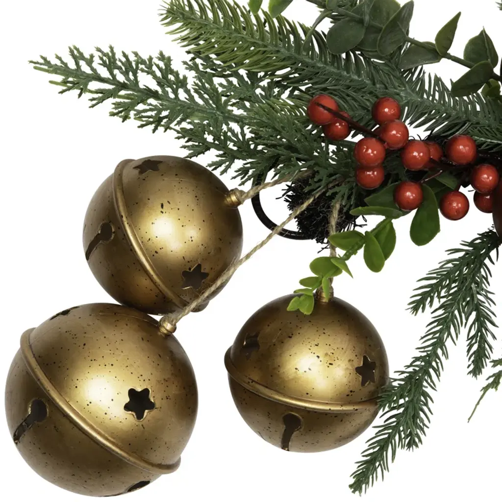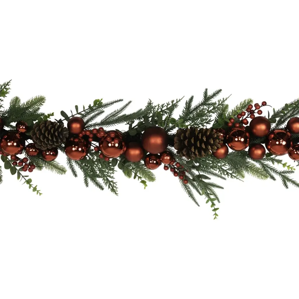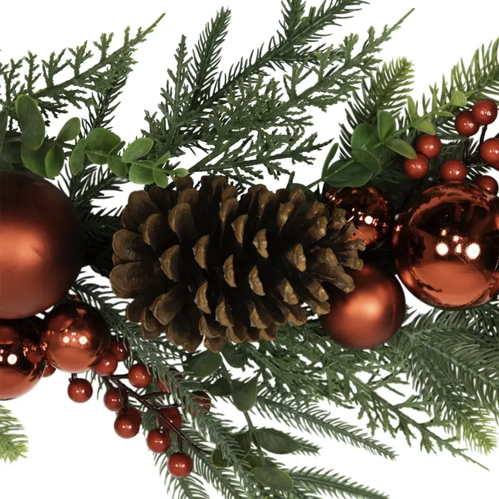 Create a warm and inviting atmosphere with this versatile and festive decoration. This unlit garland features a beautiful mix of lush foliage adorned with vibrant red shiny and matte ornaments red berries and pinecones. Each end is graced with large bronze jingle bells adding a touch of whimsy and holiday cheer. The flexible twig and wire center allow for easy customization while brown plastic loops on each end ensure simple hanging.