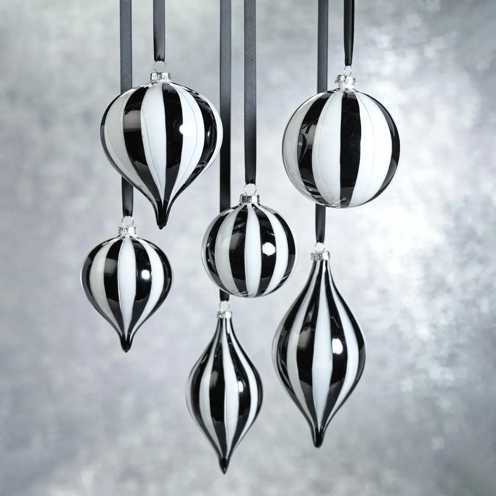 The Monochrome Stripe Glass Hanging Holiday Ornaments bring a touch of modern elegance to your festive decor. Each ornament features bold black and white stripes, creating a striking visual appeal that stands out on any holiday tree or garland. Crafted from high-quality glass, these ornaments are both durable and stylish, adding a sophisticated touch to your seasonal celebrations. Their sleek design ensures they complement various decor styles, making them a versatile and timeless addition to your holiday collection. Celebrate the season with these chic and eye-catching ornaments that effortlessly blend classic charm with contemporary flair. Black and white stripes for striking visual contrast. Set of 8 hanging ornaments. Equipped with silver ornament cap. Each comes with a string to make it easier to hang A touch of classic elegance and modern flair. Clean with a soft dry cloth.