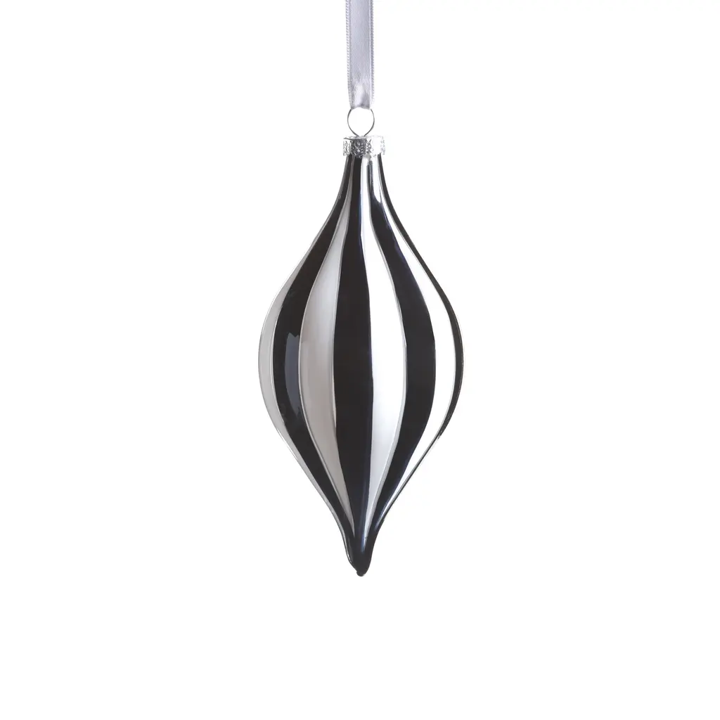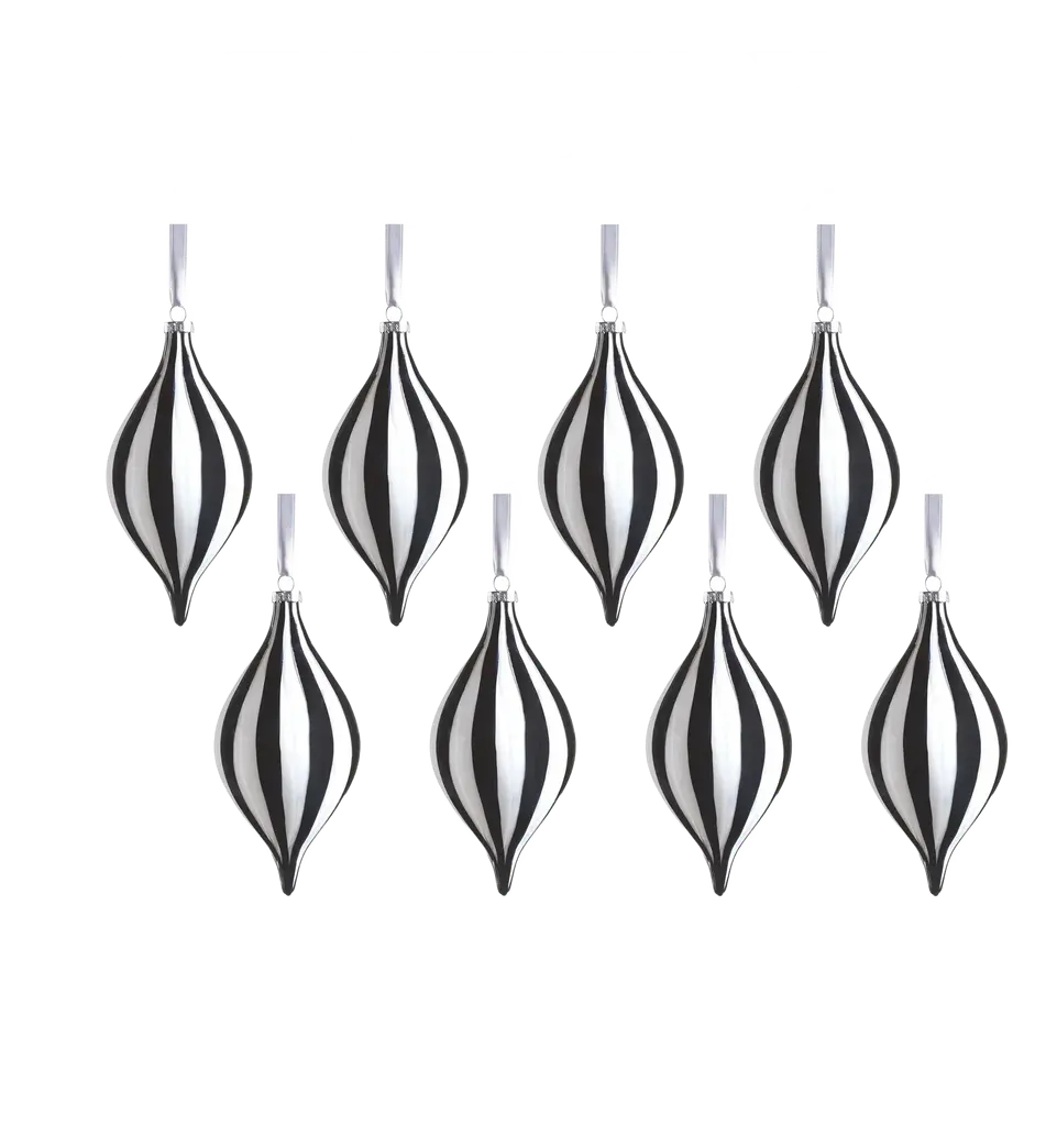 The Monochrome Stripe Glass Hanging Holiday Ornaments bring a touch of modern elegance to your festive decor. Each ornament features bold black and white stripes, creating a striking visual appeal that stands out on any holiday tree or garland. Crafted from high-quality glass, these ornaments are both durable and stylish, adding a sophisticated touch to your seasonal celebrations. Their sleek design ensures they complement various decor styles, making them a versatile and timeless addition to your holiday collection. Celebrate the season with these chic and eye-catching ornaments that effortlessly blend classic charm with contemporary flair. Features: Set of 8 hanging ornaments Black and white stripes for striking visual contrast Equipped with silver ornament cap Each comes with a string to make it easier to hang A touch of classic elegance and modern flair