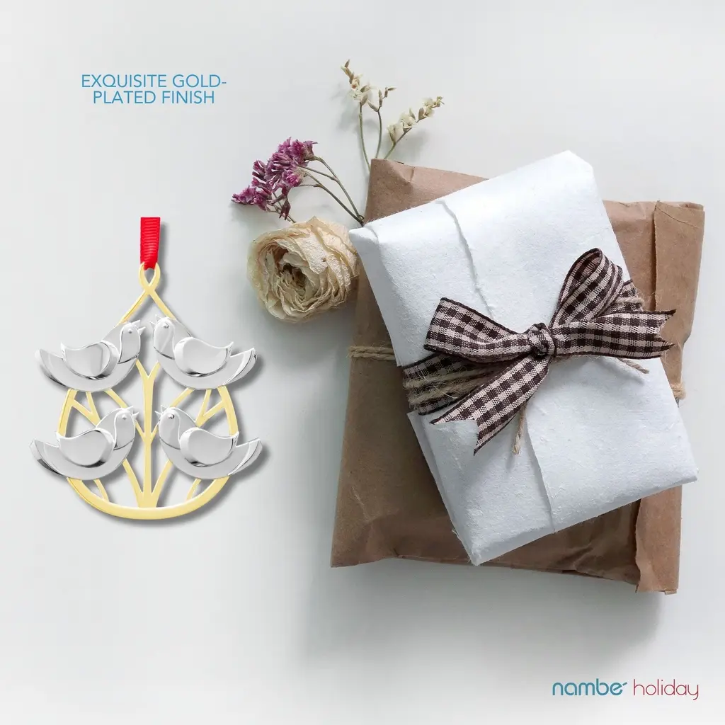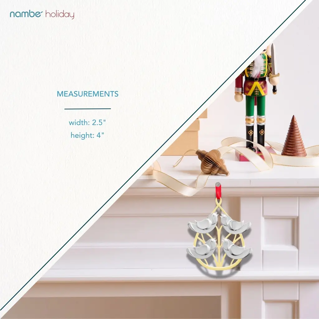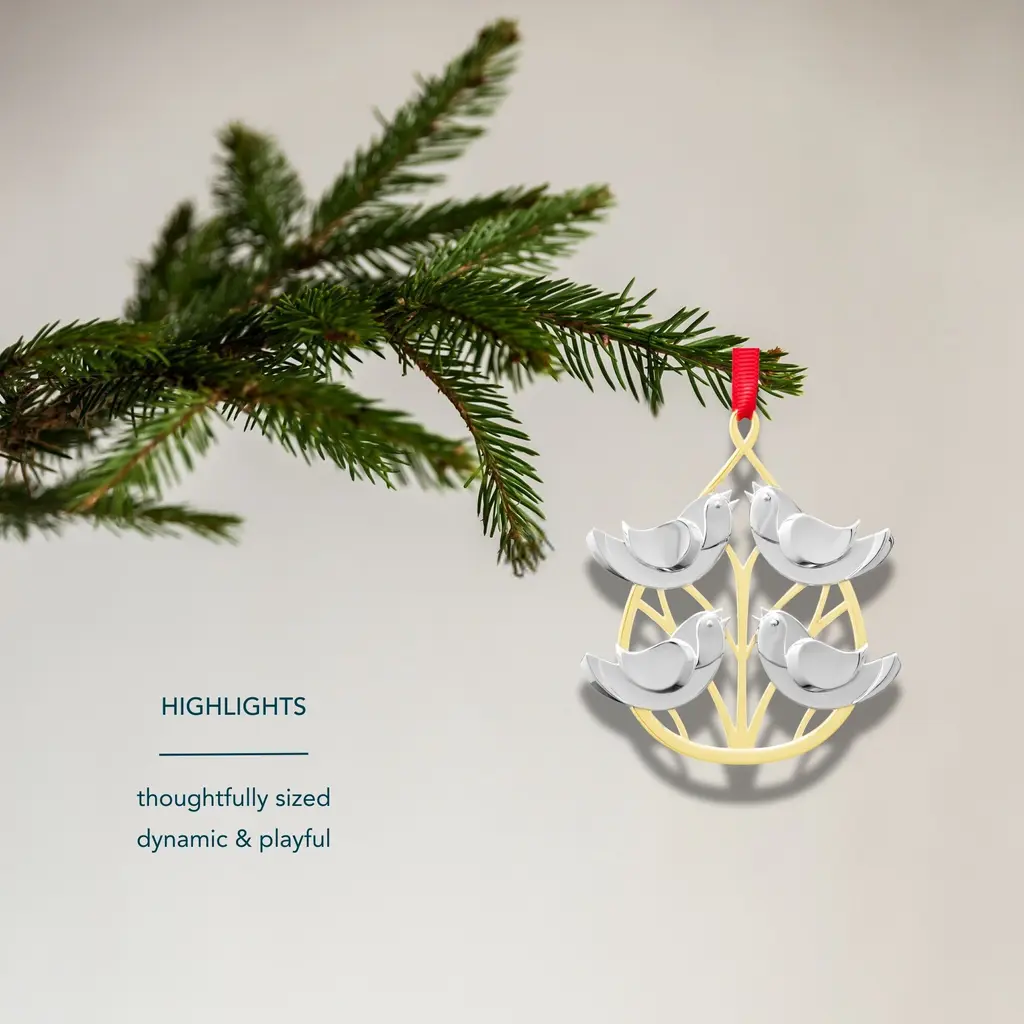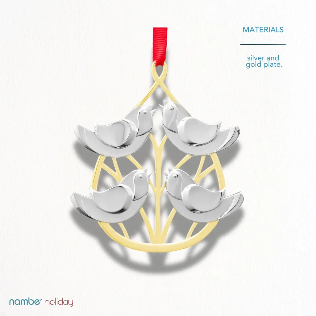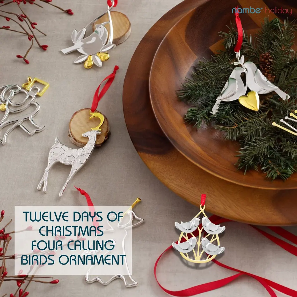 Nambe 12 Days of Christmas Ornament - Silver & Gold-Plated Holiday Decoration for Christmas Tree - Unique Christmas Tree Decorations, Festive Ornament for Seasonal Home Decor (Four Calling Birds) - NewEmbrace the holiday spirit with the Four Calling Birds Ornament, part of the Twelve Days of Christmas Ornament Series. This piece brings the classic carol to life, making it an exquisite addition to any festive setting. Expertly crafted from lustrous Silver Plate and accented with delicate touches of Gold Plate, this ornament stands out with its elegant detailing. Its sleek design and intricate craftsmanship are not just decorative but evoke the joyful magic of the season. Whether placed on your tree or arranged elsewhere in your home, it is an eye-catching focal point that adds warmth to your holiday gatherings. The Four Calling Birds Ornament is more than a decoration; it’s a cherished keepsake that celebrates the joy of the holidays. It’s part of a collectible series that captures the essence of the Twelve Days of Christmas, making it a wonderful gift for friends, family, or even yourself. Its versatility allows it to be used in various festive settings, adding a luxurious yet understated glow wherever it’s placed. Care for this ornament is effortless, requiring only a light wipe with a dry cloth to maintain its gleaming surface. Its durability ensures it will remain a treasured piece in your collection, bringing festive cheer to your home year after year. Celebrate the season with the Nambé Four Calling Birds Ornament a timeless piece that captures the magic of Christmas with its beautiful combination of materials and expert craftsmanship.FEATURES:COLOR:MATERIAL:WHAT'S IN THE BOX:PACKAGING:Retail Packaging