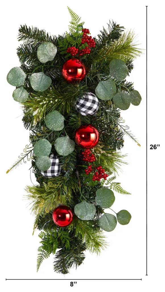 Greet guests with a bit of festive cheer. Display your holiday-inspired artificial Christmas swag in any space in need of some freshness. Variegated green evergreens are accented by glossy ornaments. Hang in any room in need of some Christmas colors. With a height of 26" house in any area. Gift to a friend that loves the holidays. 26 Holiday Christmas Greenery Ornament Artificial Swag