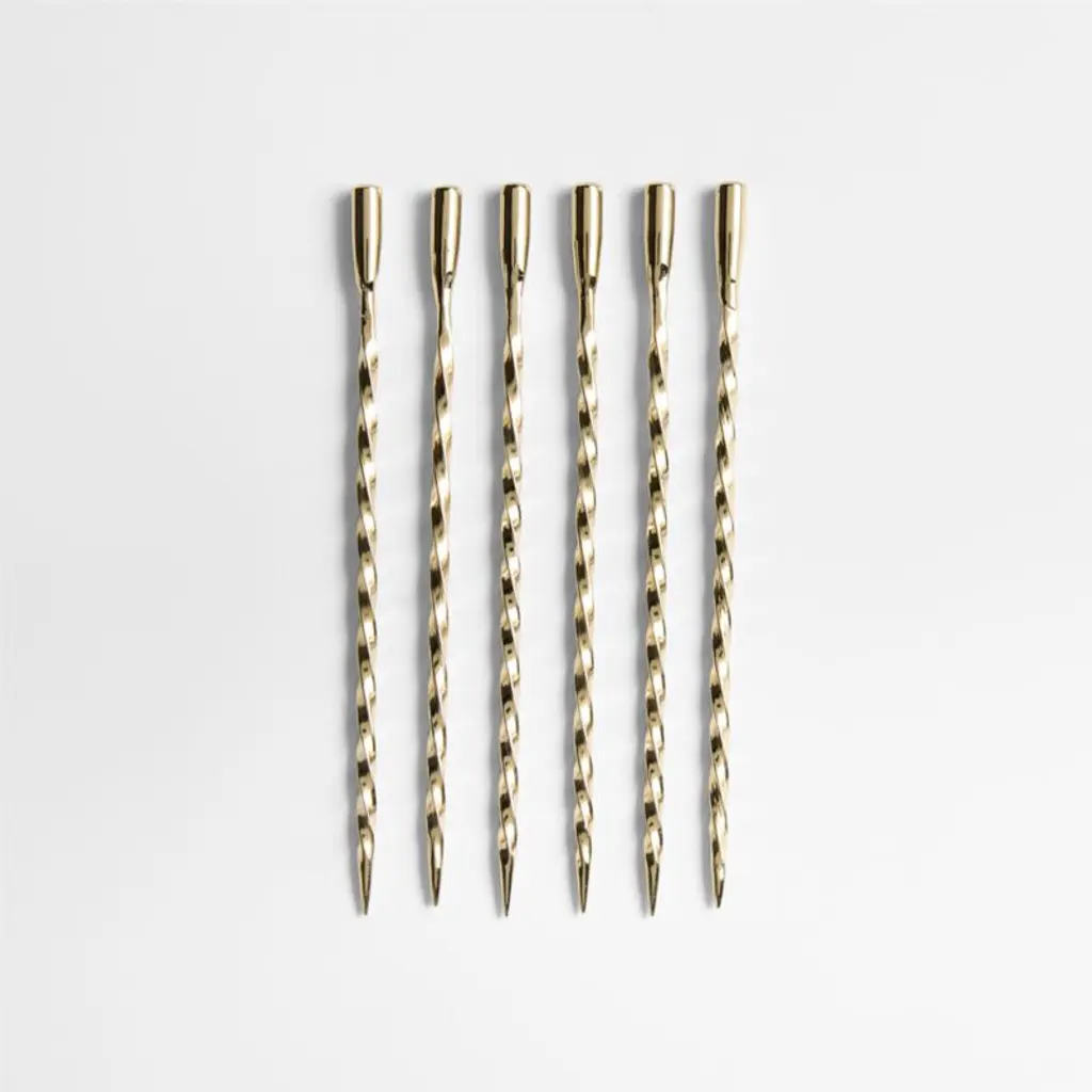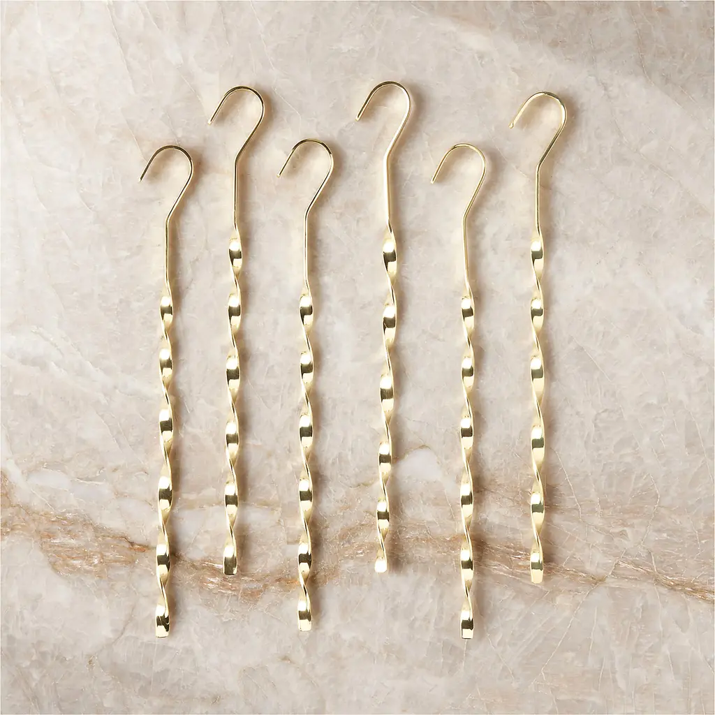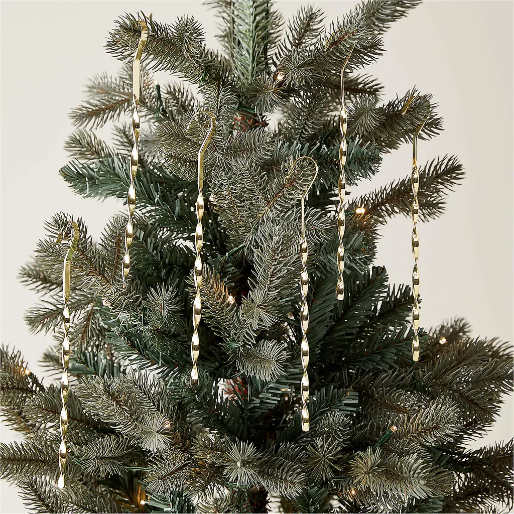 Inspired by vintage icicle ornaments, these solid brass ornaments hook directly onto the branches of the tree to add shimmer and visual interest. Their shine provides a modern—and more sustainable—take on tinsel year after year. Set of 6. CB2 exclusive. Due to the nature of the material, brass patina will vary in color and darken over time.