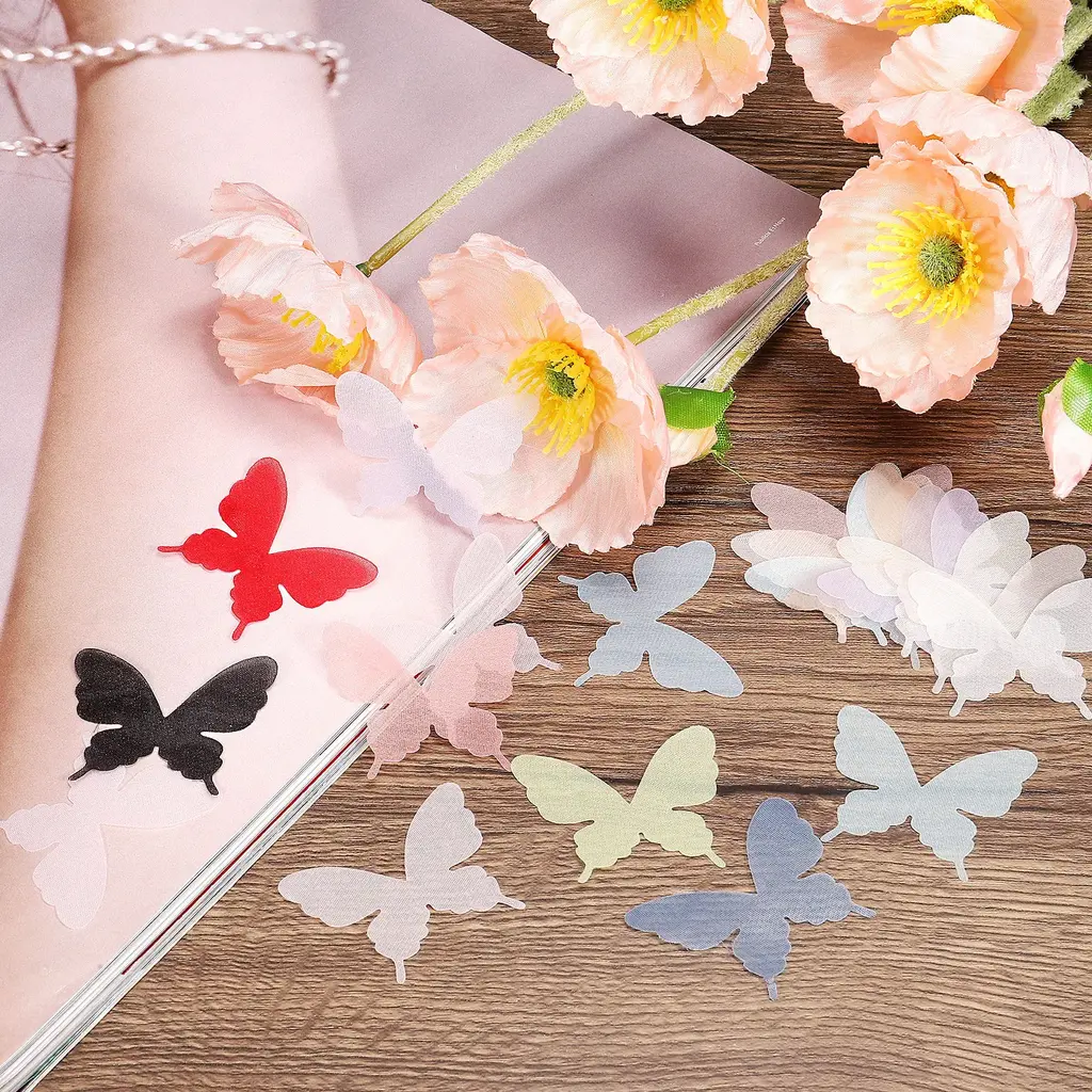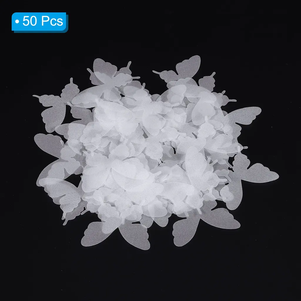 This organza butterfly can be used for a wide variety of applications, such as wedding decorations, clothing embellishments, and other DIY craft projects. You can also use it to decorate earrings, hair clips and more, adding visual appeal to your accessories and creations.SpecificationMaterial: OrganzaSize: 40 x 35mm / 1.6 x 1.4 inch(L*W)Packing List: 50 x Butterfly AppliquesAdvantageThese butterfly ornaments are made of durable organza fabric that ensures long-term use and a beautiful, elegant appearance. the butterfly ornament features a delicate and intricate design that adds a touch of elegance and sophistication to any decor.InstructionAttach the ornament to the area or object using a string, wire, tape, or other suitable material. Adjust the position and angle of the ornament to achieve the desired look and effect.NOTE: They may stick together when arrived and you need to manually separate the embellishments piece by piece.
