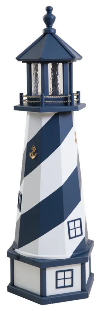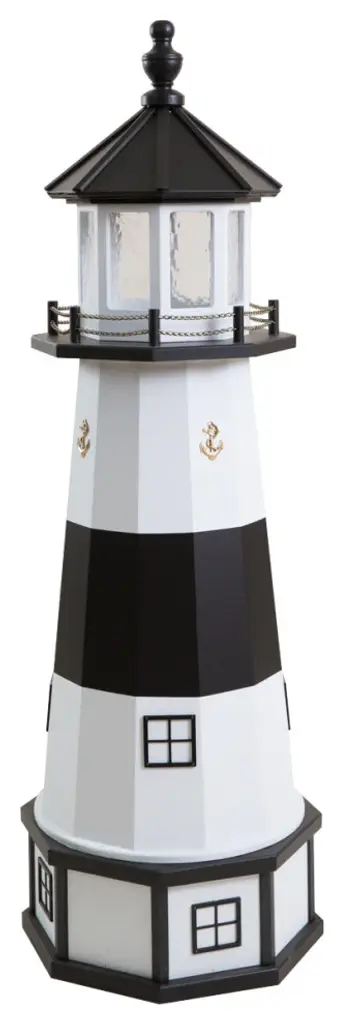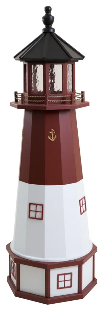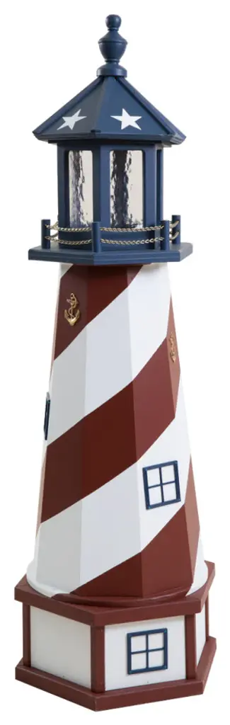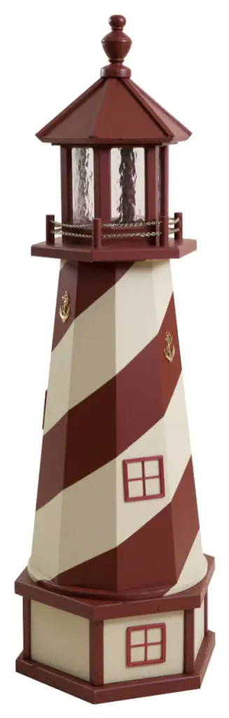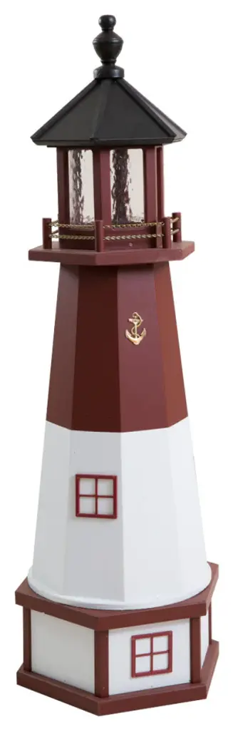 Create a gorgeous center piece in any garden or on any porch with this gorgeous Amish made lighthouse! This lighthouse has a hand-painted wooden frame with an accompanying poly lumber top and matching base.Amish made in the USAWood frame with poly lumber top and baseHand painted exterior paint on wood frameSolar powered light is 3.2 volt rechargeableDigital colors may vary slightly from actual product colors