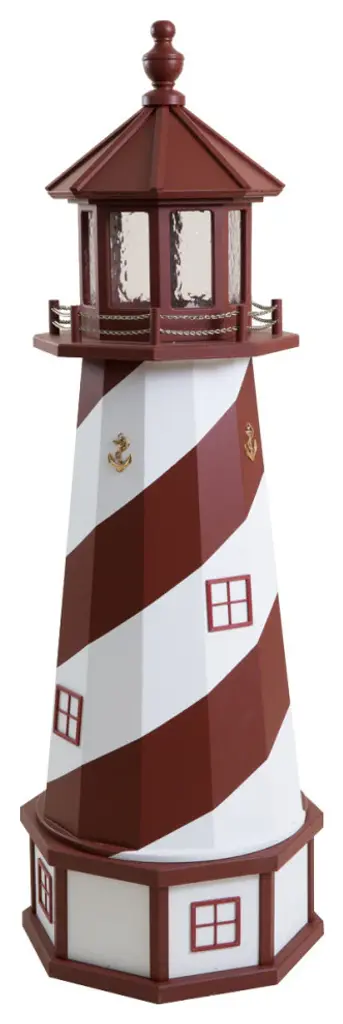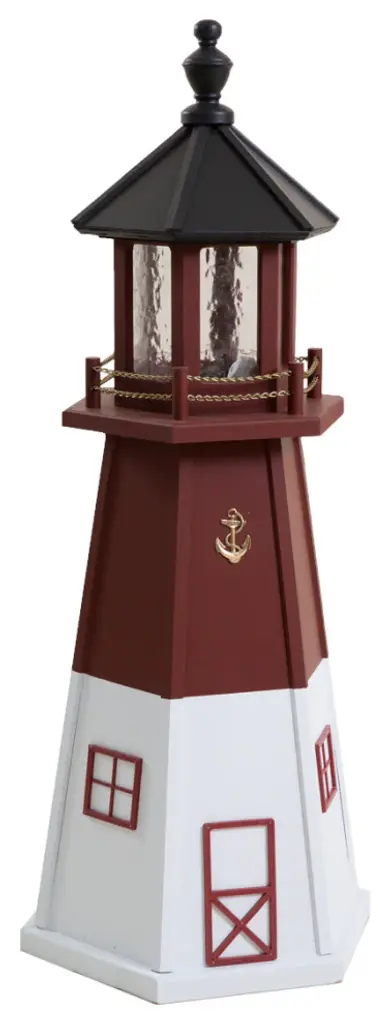 Create a gorgeous center piece in any garden or on any porch with this gorgeous Amish made lighthouse! This lighthouse has a hand-painted wooden frame with an accompanying poly lumber top and matching base.Amish made in the USAWood frame with poly lumber top and baseHand painted exterior paint on wood frameSolar powered light is 3.2 volt rechargeableDigital colors may vary slightly from actual product colors