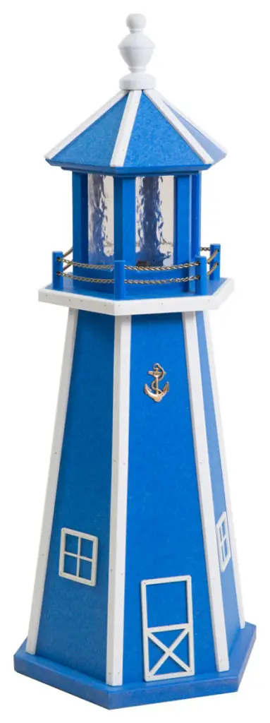 Create a gorgeous center piece in any garden or on any porch with this gorgeous Amish made lighthouse! This lighthouse has a hand-painted wooden frame with an accompanying poly lumber top and matching base.Amish made in the USAWood frame with poly lumber top and baseHand painted exterior paint on wood frameSolar powered light is 3.2 volt rechargeableDigital colors may vary slightly from actual product colors