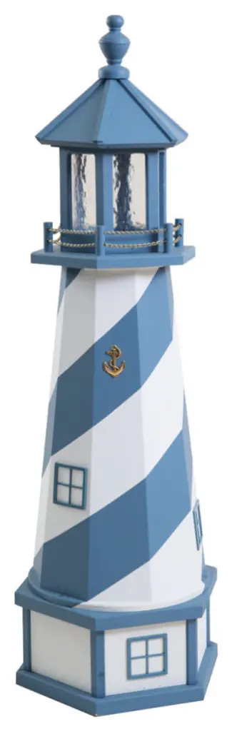 Create a gorgeous center piece in any garden or on any porch with this gorgeous Amish made lighthouse! This lighthouse has a hand-painted wooden frame with an accompanying poly lumber top and matching base.Amish made in the USAWood frame with poly lumber top and baseHand painted exterior paint on wood frameSolar powered light is 3.2 volt rechargeableDigital colors may vary slightly from actual product colors