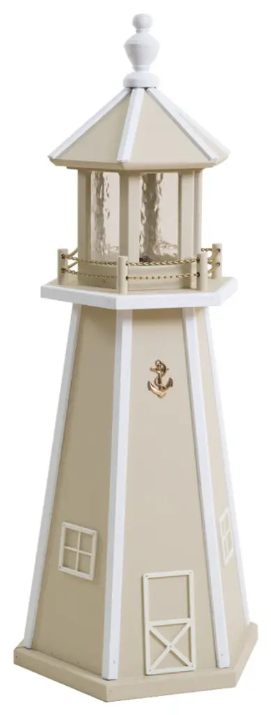 Create a gorgeous center piece in any garden or on any porch with this gorgeous Amish made lighthouse!Amish Made in the USA High quality materials and hand painted with exterior paintIf Standard electric light is chosen, the cord is 8 feet long If Solar Light is chosen, the 3.2 rechargeable solar battery is provided. Digital colors may vary slightly from actual product colors