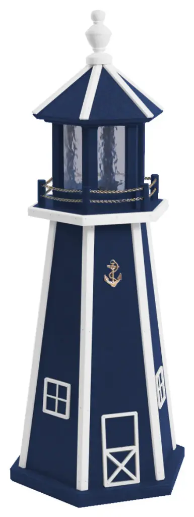 Create a gorgeous center piece in any garden or on any porch with this gorgeous Amish made lighthouse!Amish Made in the USA High quality materials and hand painted with exterior paintIf Standard electric light is chosen, the cord is 8 feet long If Solar Light is chosen, the 3.2 rechargeable solar battery is provided. Digital colors may vary slightly from actual product colors