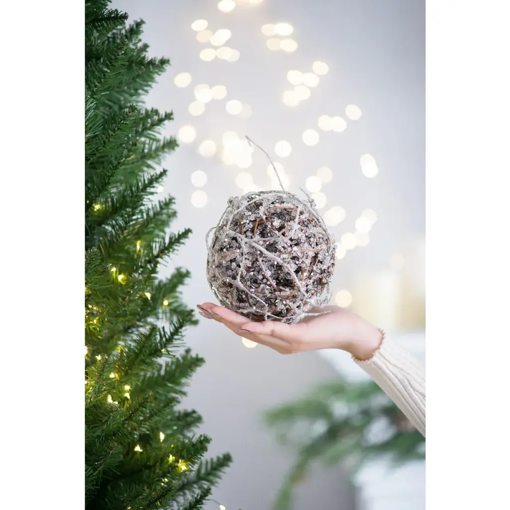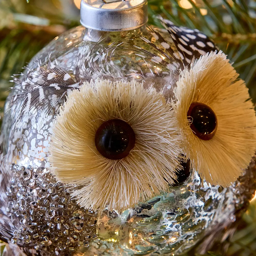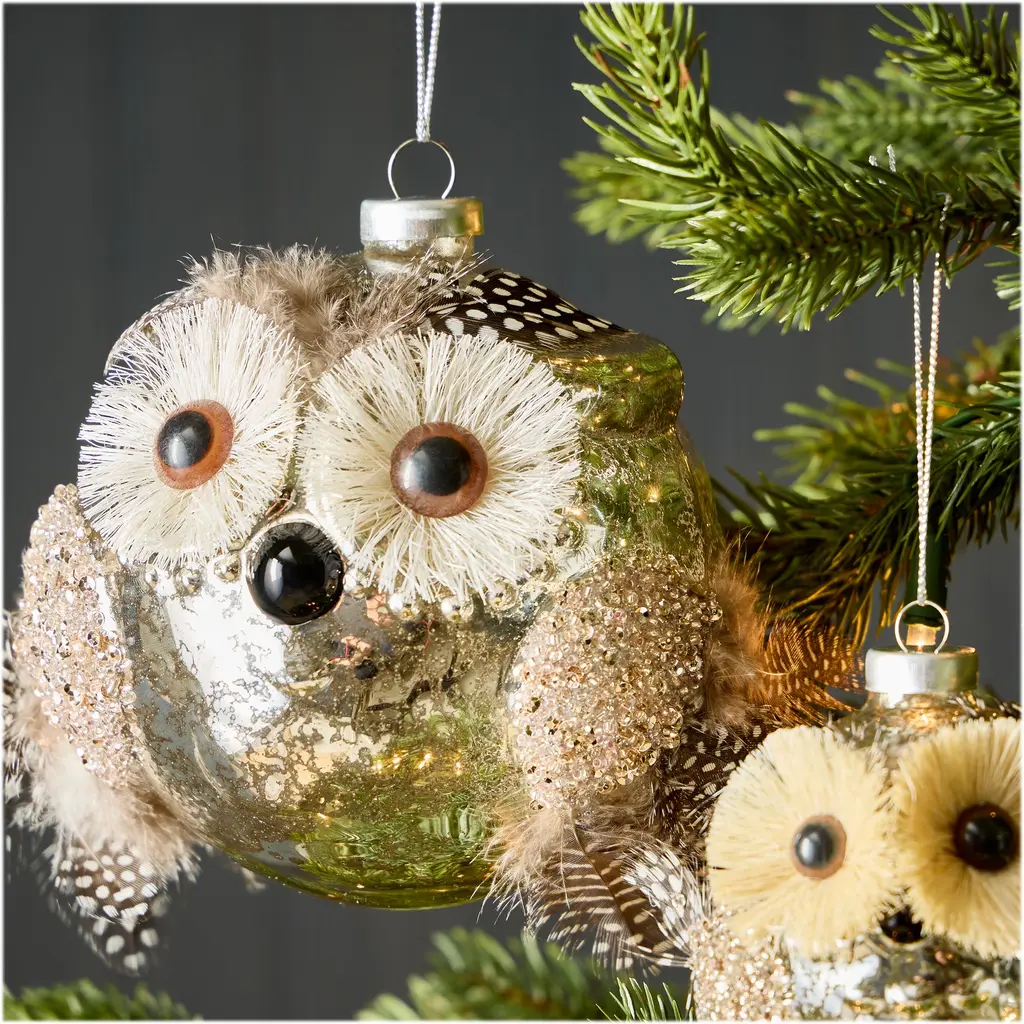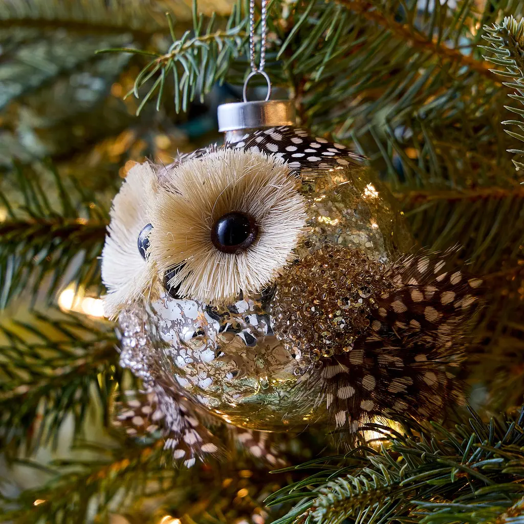 Owl ornaments look right at home nestled in trees. It's covered all over in feathers and beads. Made from delicate glass.
