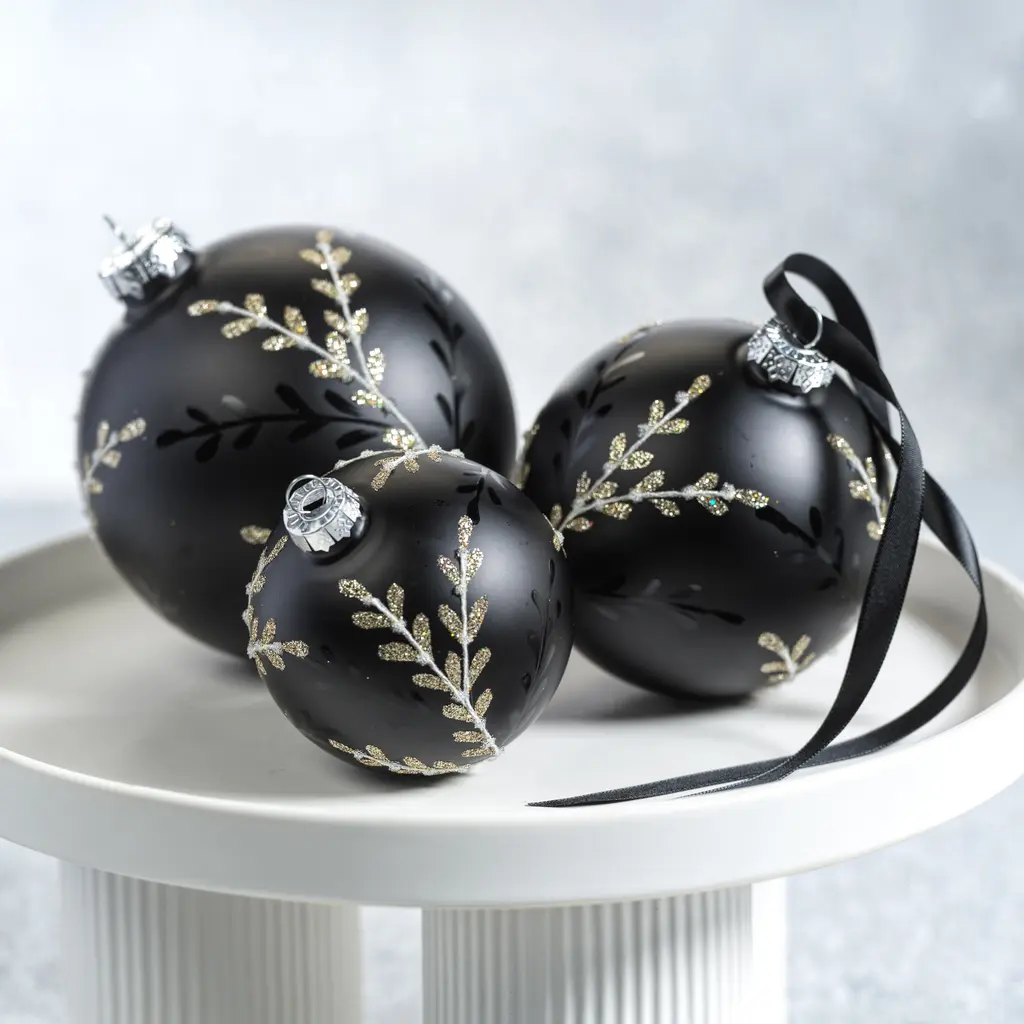 Elevate your holiday décor with our sophisticated matte black glass ball ornaments. Featuring an exquisite leaf pattern design, these ornaments beautifully combine shiny silhouette styles with glittered elements. The leaves are elegantly adorned with silver glitter, while the stems are intricately crafted with white thread, accented by tiny beads and a touch of glitter. Perfect for adding a touch of elegance and sparkle to your festive decorations, these ornaments are a must-have for the holiday season. Features: Set of 6 ball ornaments of the same size Features a sophisticated leaf pattern design Equipped with silver ornament cap Each comes with a string to make it easier to hang Perfect addition to your holiday tree decor Clean with a soft dry cloth
