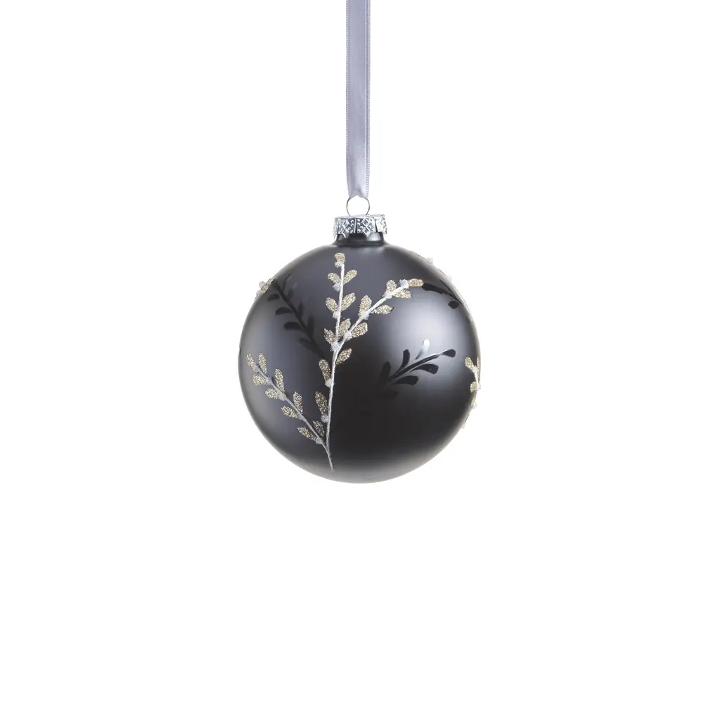 Elevate your holiday décor with our sophisticated matte black glass ball ornaments. Featuring an exquisite leaf pattern design, these ornaments beautifully combine shiny silhouette styles with glittered elements. The leaves are elegantly adorned with silver glitter, while the stems are intricately crafted with white thread, accented by tiny beads and a touch of glitter. Perfect for adding a touch of elegance and sparkle to your festive decorations, these ornaments are a must-have for the holiday season. Features: Set of 6 ball ornaments of the same size Features a sophisticated leaf pattern design Equipped with silver ornament cap Each comes with a string to make it easier to hang Perfect addition to your holiday tree decor Clean with a soft dry cloth