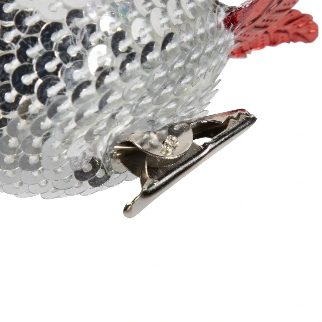 Add a touch of opulent elegance to your holiday decor with this peacock feather Christmas ornament. This exquisite ornament boasts a stunning design featuring the mesmerizing beauty of peacock ocelli feathers. Made with a metal alligator clip you can attach this feather ornament to your Christmas tree or use it as a decorative accent in floral arrangements centerpieces wreaths and garlands. Product Features: Ocelli Christmas ornament Peacock ocelli feather design accented with faux clear crystals and strings of silver beads One-sided flat back ornament Comes ready to attach with a metal alligator clip Recommended for indoor use only Dimensions: 6" high x 5" wide Material(s): foam/feathers/plastic/wire