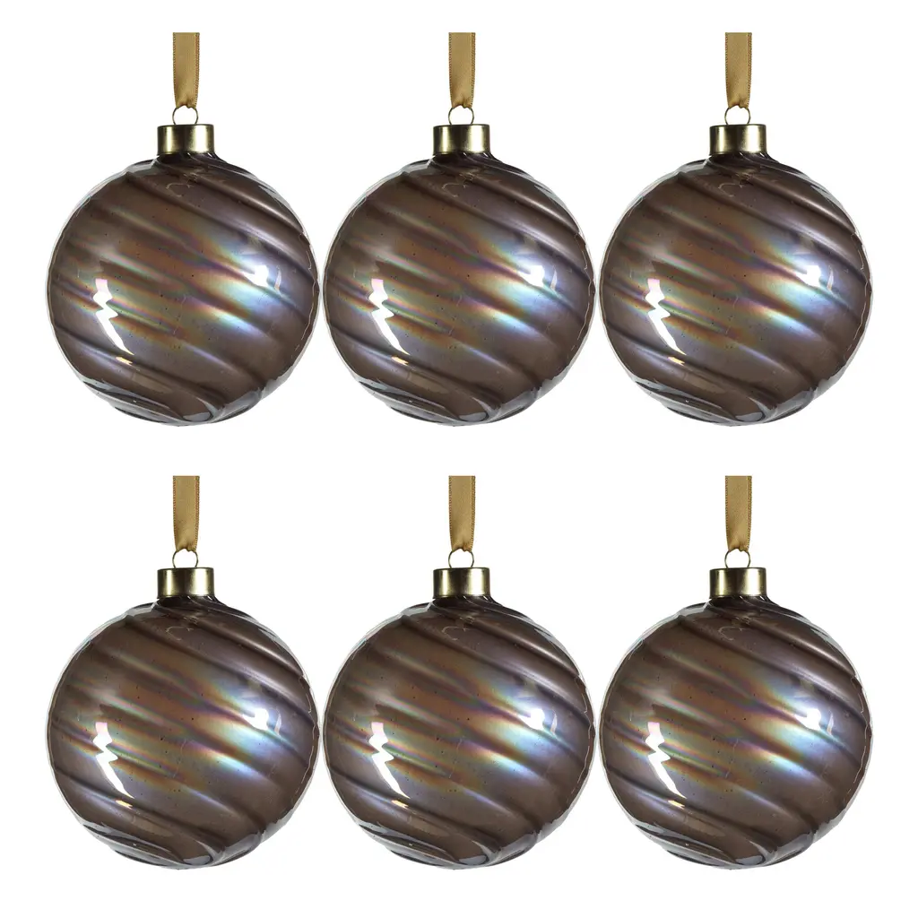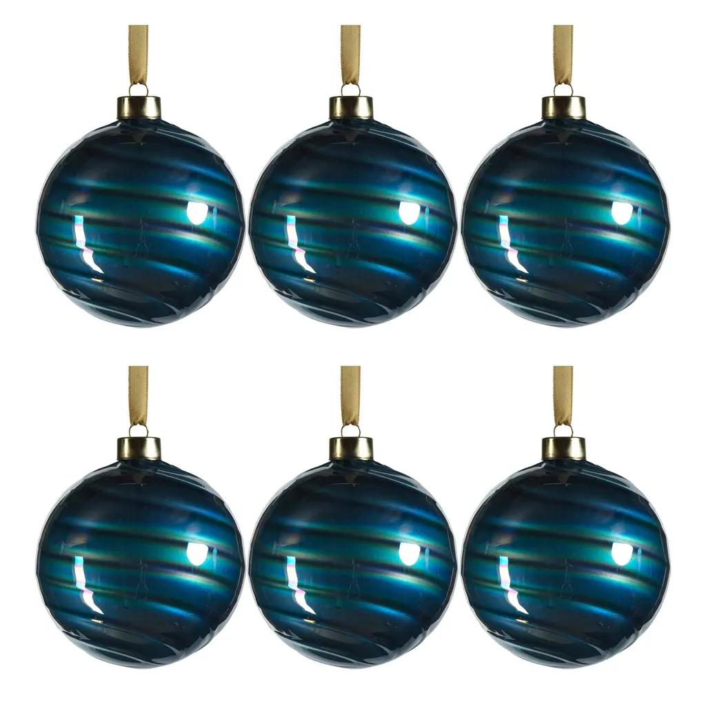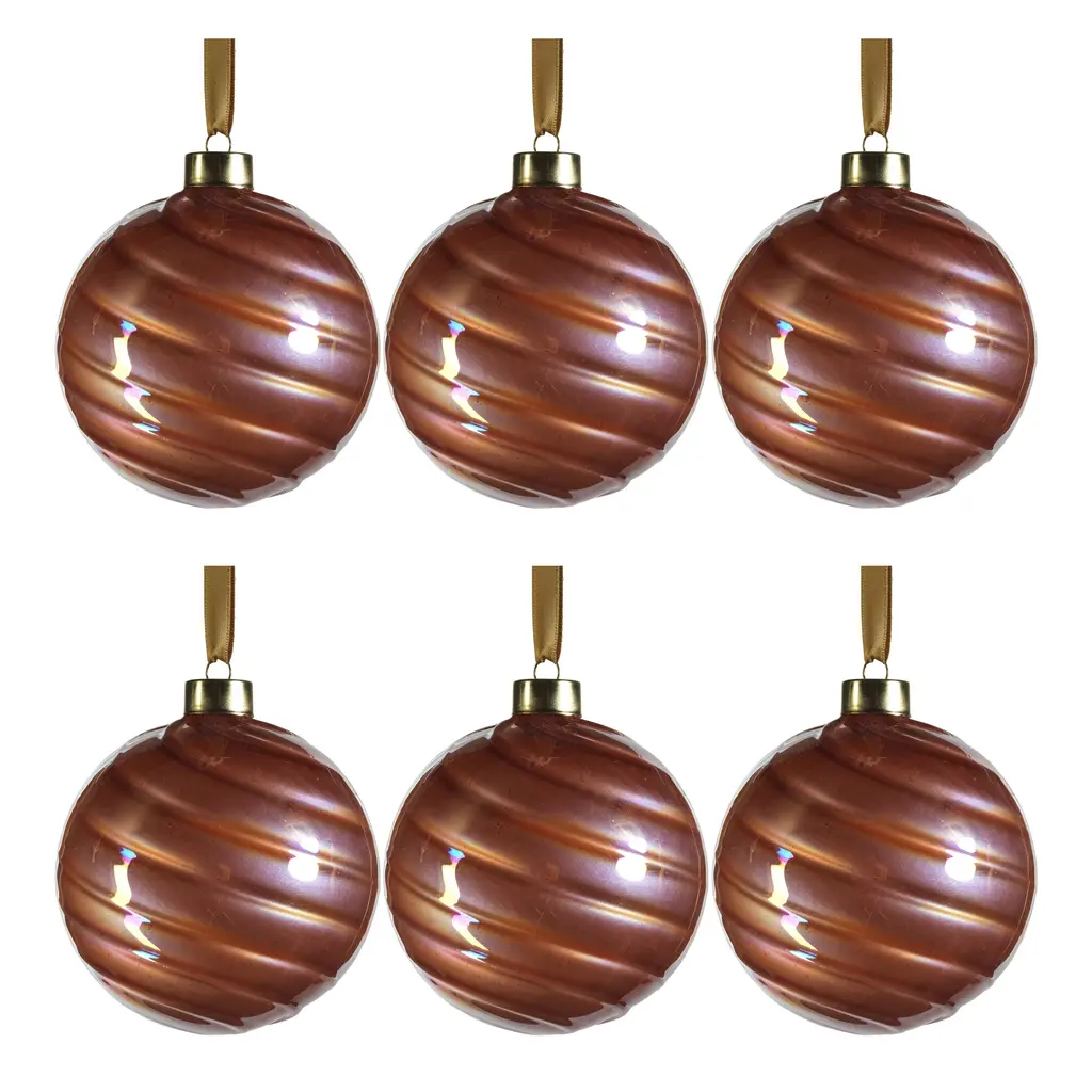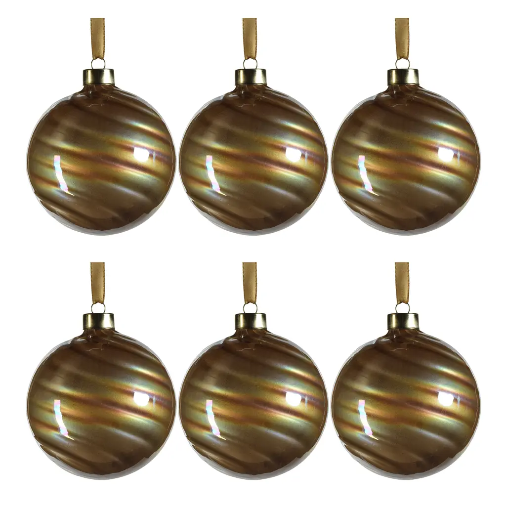 This elegant set is amazing for any holiday décor. The pearl luster finish gives the ornaments a soft, pearly sheen which enhances the color of the piece. The swirl design adds an artistic and whimsical touch to the ornaments, evoking a sense of movement and fluidity. The combination of the swirl patterns and the luster finish makes these glass ball ornaments truly unique and visually captivating. A metal cap with ring is attached to each round glass decoration for easy hanging on trees, garlands, and wire. Features: Set of 6 ball ornaments of the same size Pearl luster finish creates a dazzling effect Adorned with intricate swirl designs Each comes with a string to make it easier to hang Perfect addition to your holiday tree decor