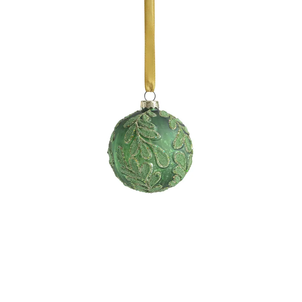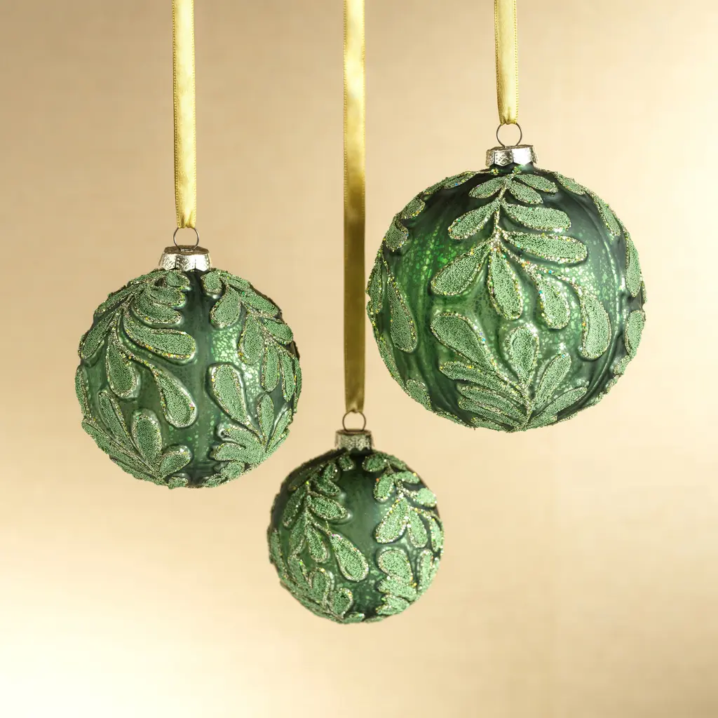 Phyllon 3.25" Beaded Leaf Pattern Glass Ball Ornaments, Set Of 6 - Glass - Green