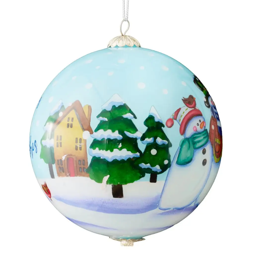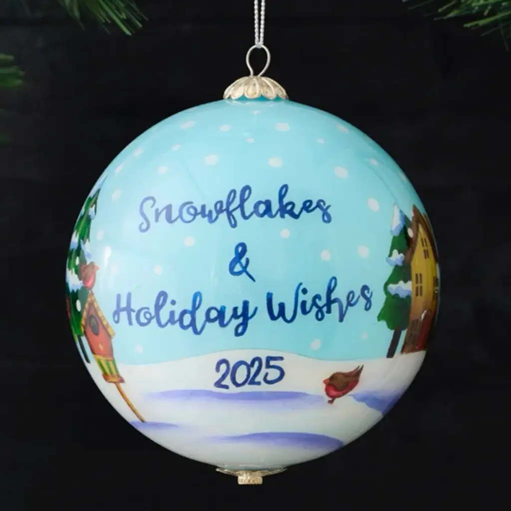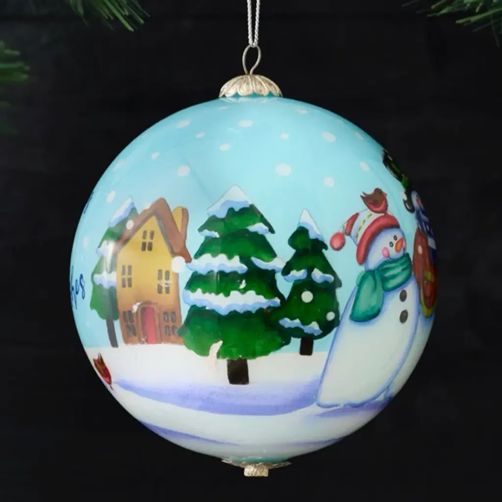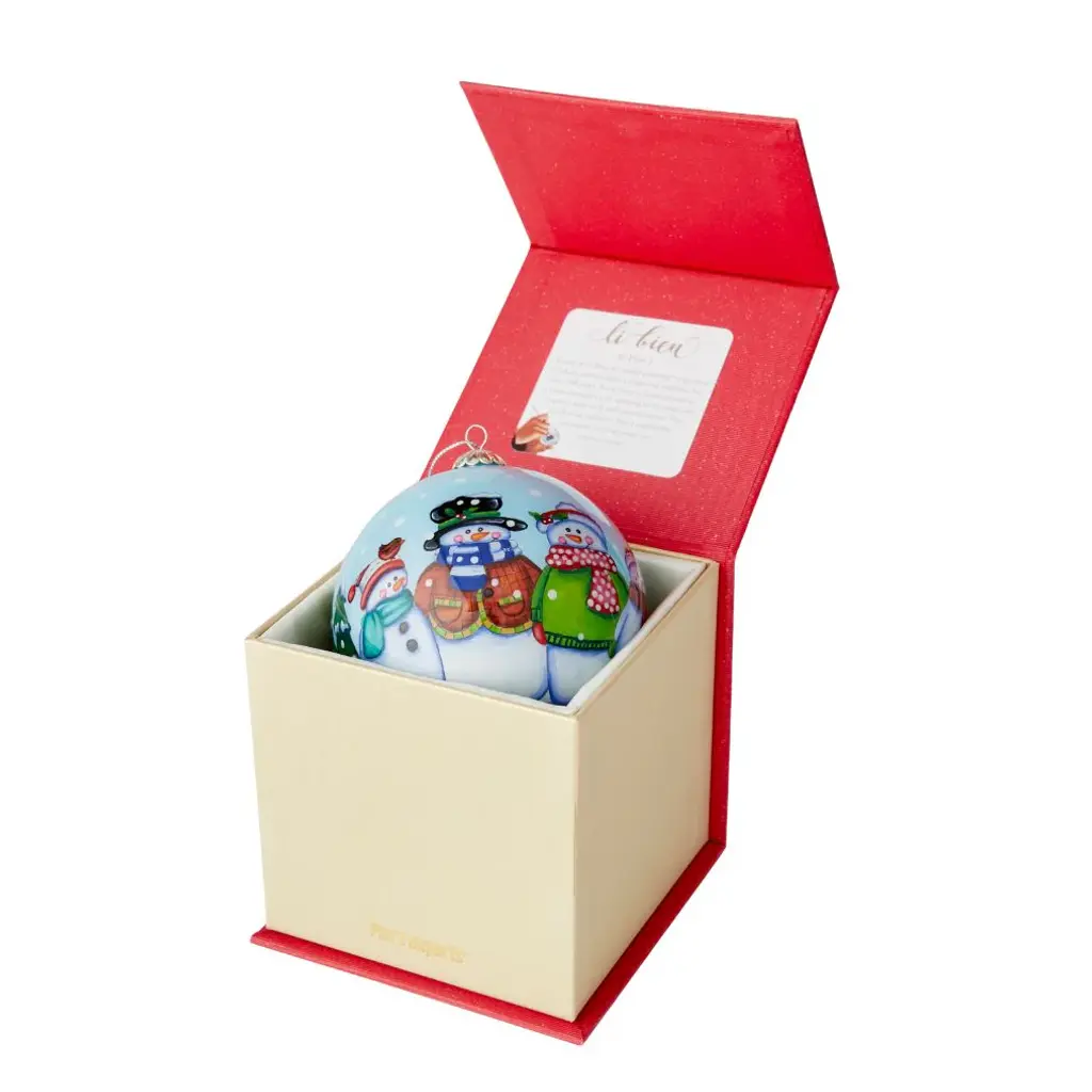 Gathered in joy and happiness, this snow-family is ready for Christmas. This glass ornament is painted from the inside using the Li Bien technique, and is dated 2025. Make this Pier 1 tradition your tradition.