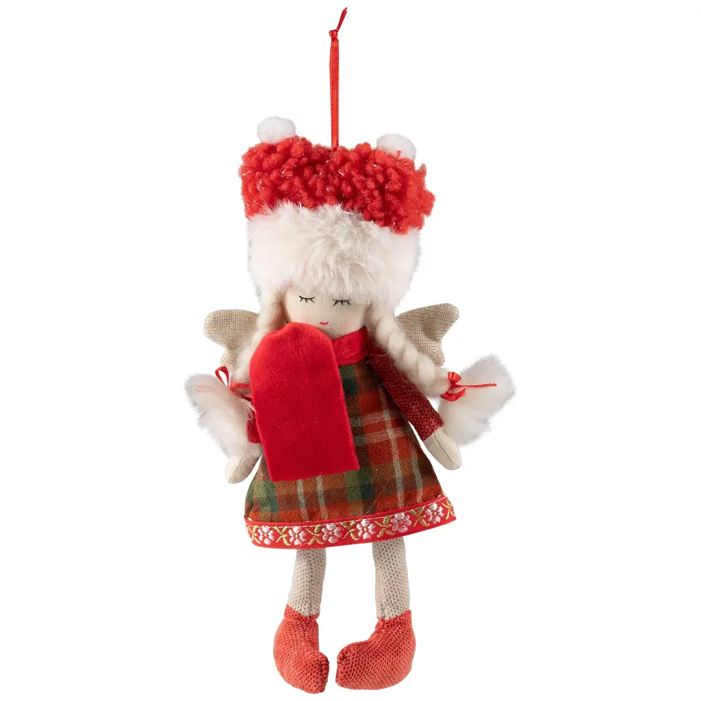 Add a touch of celestial charm to your holiday decor with this angel girl Christmas ornament! This one-sided ornament features a darling angel girl donning braided pigtails adorned with festive red ribbons. Dressed in a delightful plaid green red and white dress accented with a stitched flower ribbon trim she exudes timeless holiday cheer. Her textured winter hat complete with plush faux fur trim adds an extra layer of cozy warmth. And what's an angel without her shimmering wings? Adorned with glitter for an extra dose of magic this ornament comes ready to hang on a red ribbon bringing joy and enchantment to your seasonal festivities. Product Features: Angel girl Christmas ornament With braided pigtails dressed in a plaid dress and a faux fur trim winter hat Accented with glittered wings One-sided ornament Comes ready to hang on a red ribbon Recommended for indoor use only Dimensions: 8.5"H x 5.5"W x 2"D Material(s): fabric