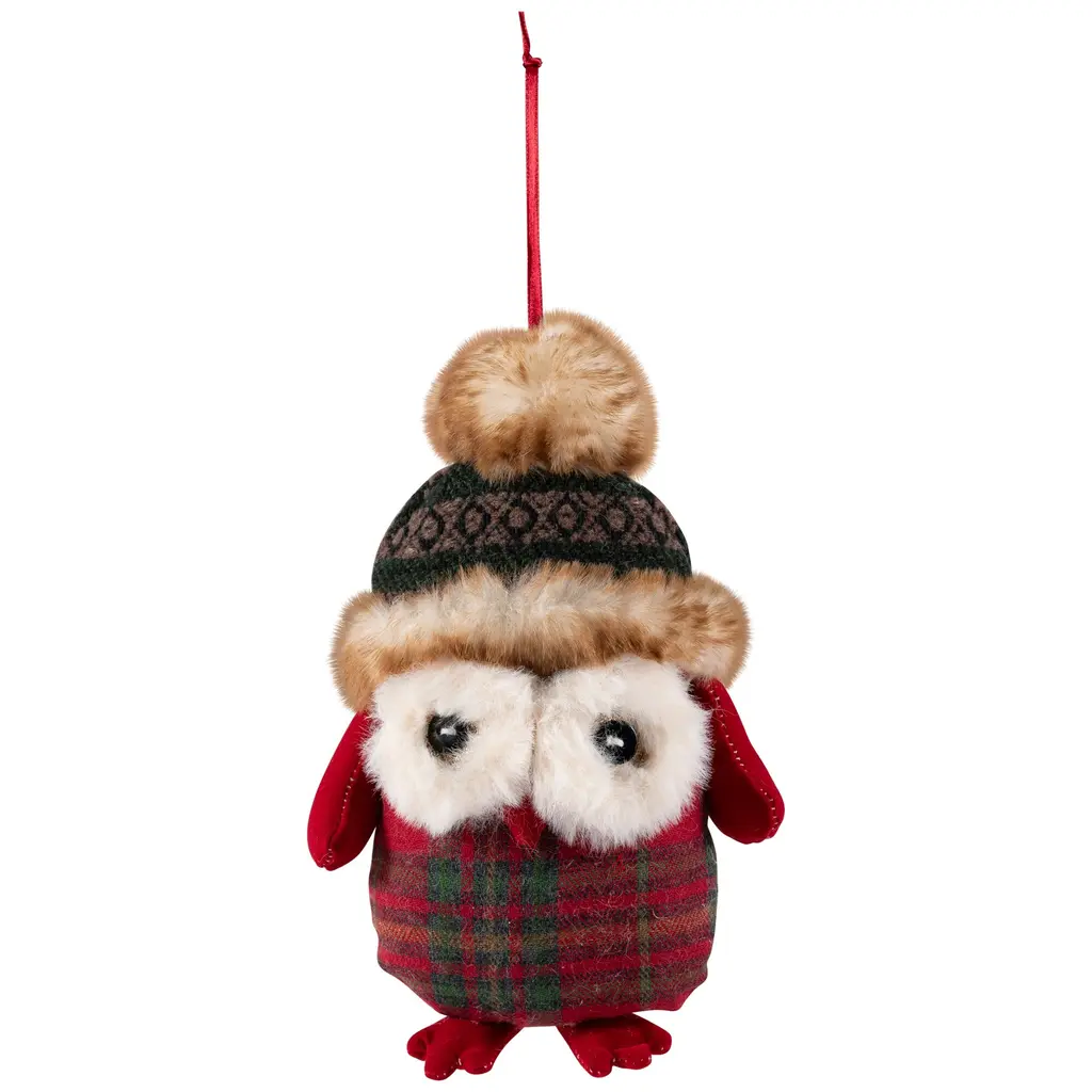 Add a touch of woodland charm to your Christmas tree with this adorable baby owl ornament! This fully dimensional ornament features an adorable baby owl dressed in a cozy plaid outfit, complete with a knitted faux fur trimmed winter hat adorned with a playful pom-pom. Soft faux fur and shimmering gold glitter accents beautifully frame the owl's eyes, adding a hint of festive sparkle. Ready to hang on a red ribbon, this darling ornament is sure to bring joy to your holiday decor year after year. Product Features: Owl plush Christmas ornament Baby owl design dressed in a plaid outfit with a knitted faux fur trimmed winter hat complete with a pom-pom top Soft faux fur and shimmering gold glitter accents beautifully frame the owl's eyes Fully dimensional ornament Comes ready to hang on a red ribbon Recommended for indoor use only Dimensions: 7" high x 5" wide x 2.5"D Material(s): fabric