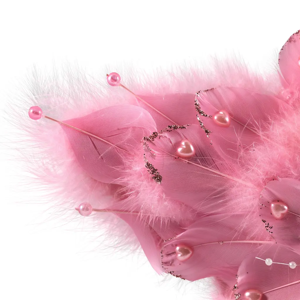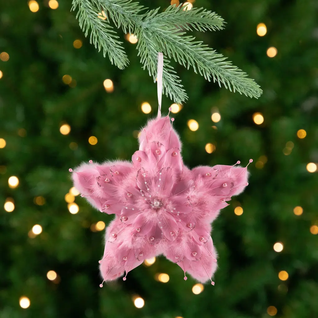 Add a touch of elegance and whimsy to your tree decor with this star Christmas ornament. This enchanting star-shaped ornament boasts a delicate feather flower motif at its center exuding a sense of grace and charm. Adorned with silver glitter edges the feathers shimmer in the light while elegant white faux pearls add a luxurious touch. With its one-sided design flat back and complete with a pink ribbon for easy display this ornament is perfect for hanging on your tree wreath or mantel. Product Features: Star Christmas ornament Feathered star shaped ornament with pink heart accents The feathers are adorned with silver glitter edges and faux pearls One-sided flat back ornament Comes ready to hang on a pink ribbon Recommended for indoor use only Dimensions: 12"H x 12"W x 1"D Material(s): foam/feathers/plastic/wire