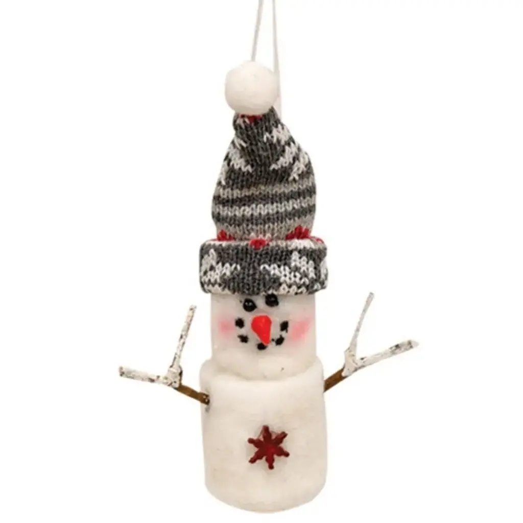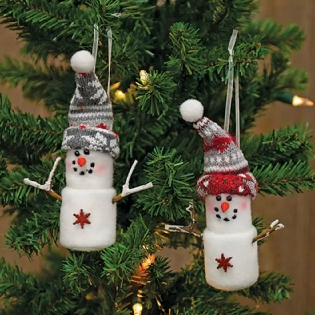 Features:Description:Winter forecast calls for cute! Dress your Christmas tree with the Holiday Marshmallow Ornaments for delightful smiles all season long. The decorative plush ornaments are made of a soft felt material made to look like cheery snowmen. Both feature details like smiling faces with rosy red cheeks, twig arms, and snowflake charms while one wears a red knitted hat and the other, a gray winter hat. They include a string hanger for easy hanging on a tree or cabinet knob. Each ornament measures 6" high by 3.75" wide by 1.5" deep.