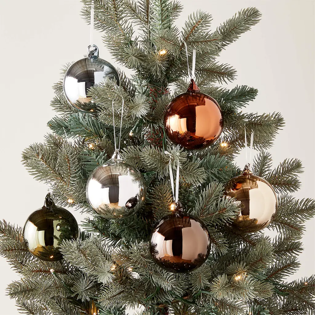 Our set of six metallic ornaments envelops the tree in tones of silver, olive green, light amber, rust, ice blue and rich dark brown. Place one set to create subtle accents, or use multiples to adorn every branch with a kaleidoscope of shine and color. CB2 exclusive.