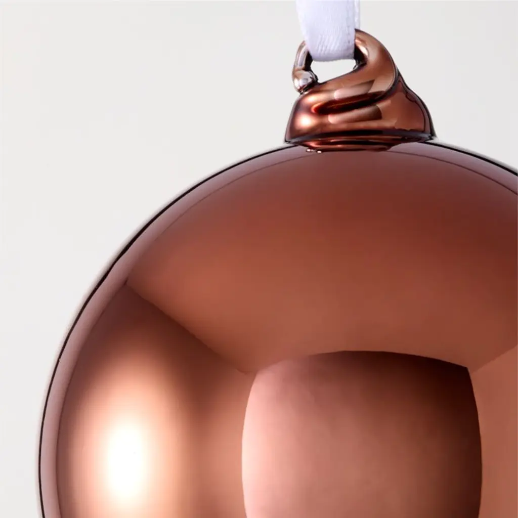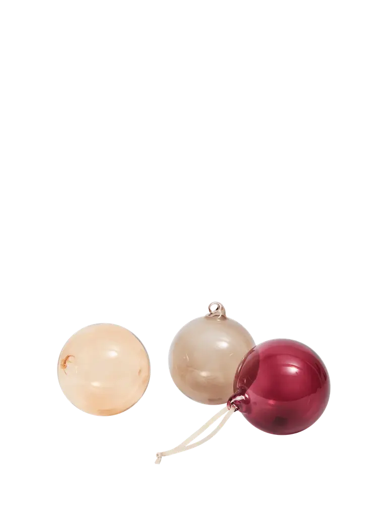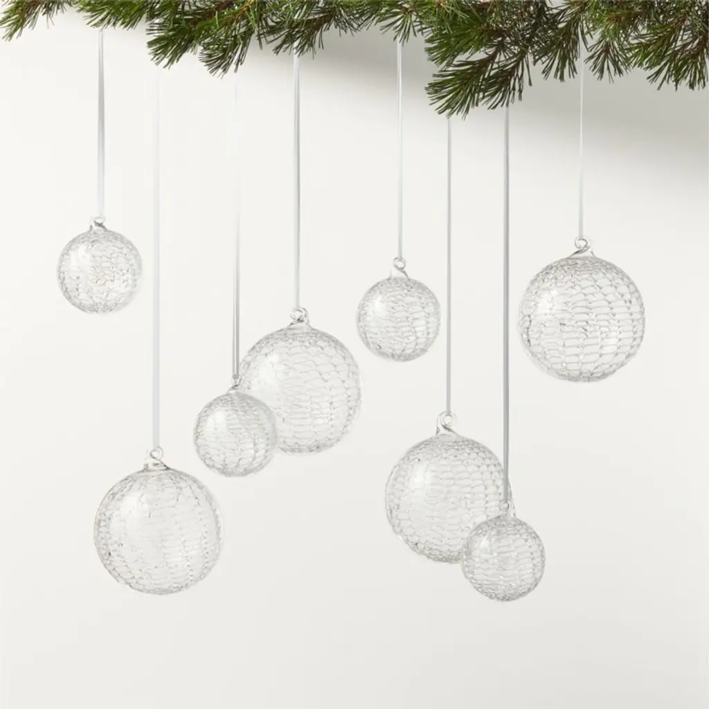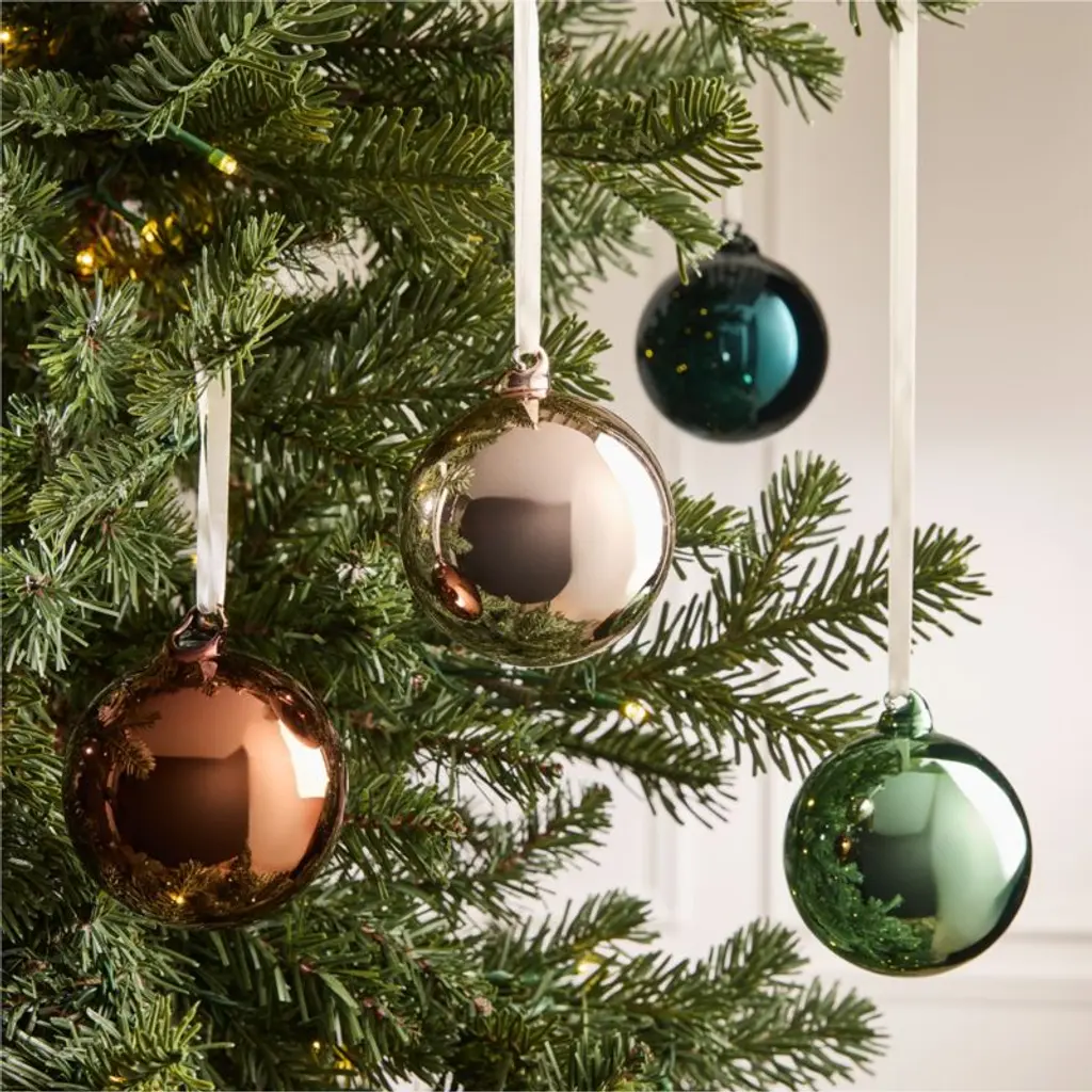 Glass ornaments in metallic jewel tones add a festive glow to the Christmas tree. CB2 exclusive.