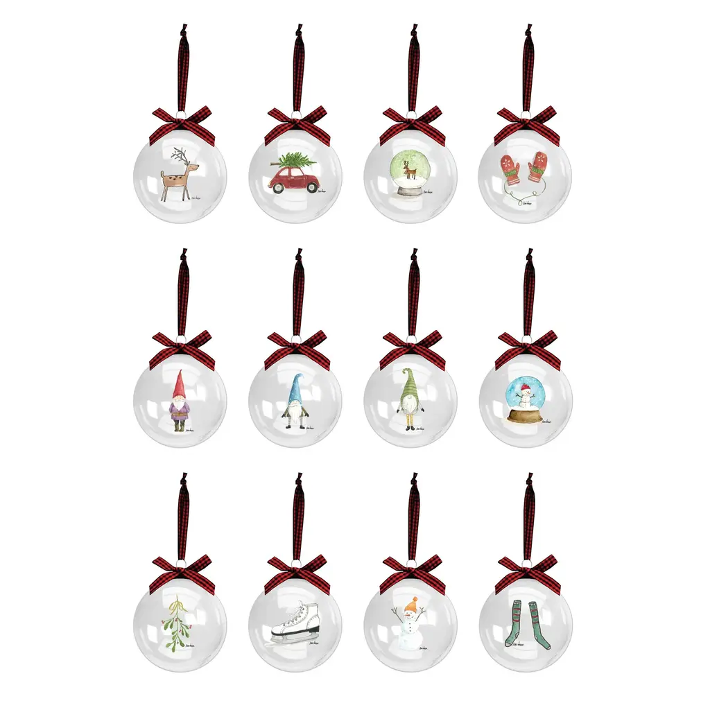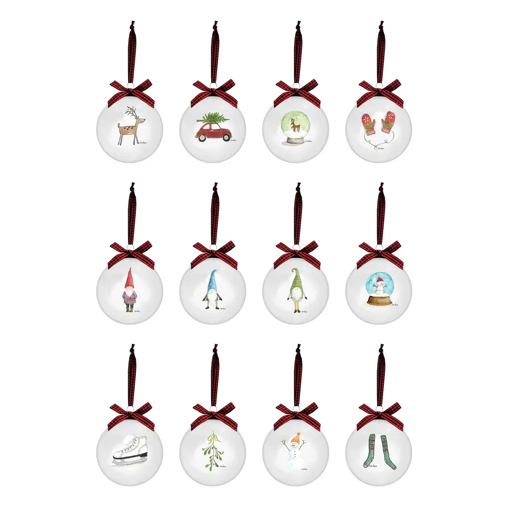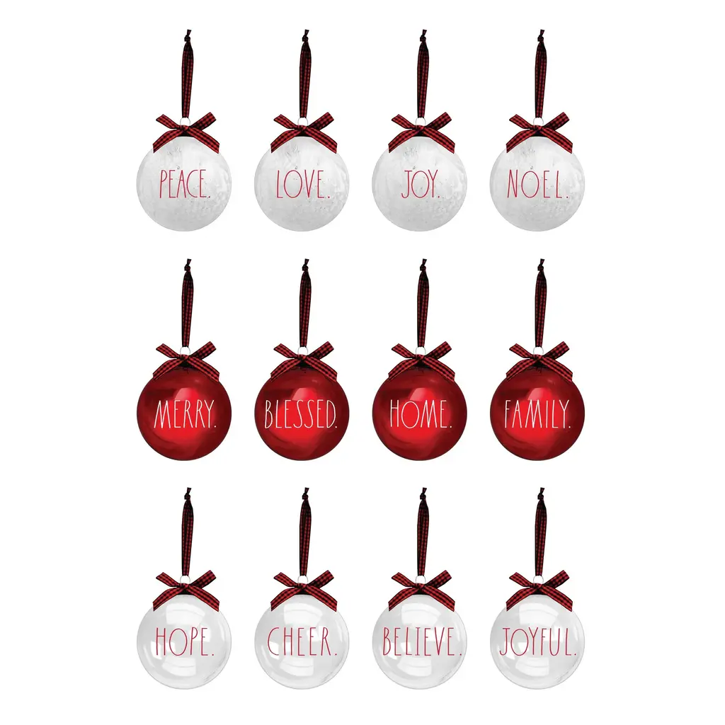 Decorate your home with the holiday spirit using Rae Dunn Set of 12 Christmas Ornaments made of high-quality glass. Each ornament measures 60mm (2.36") in diameter and features vibrant colors with superior definition and luster, adding joy to your home for years to come. The ornaments are made from one piece of molten glass, creating a seamless, immaculate surface finish. The ornaments come ready to hang with metal hooks and decorative red ribbons for a festive touch.Features: