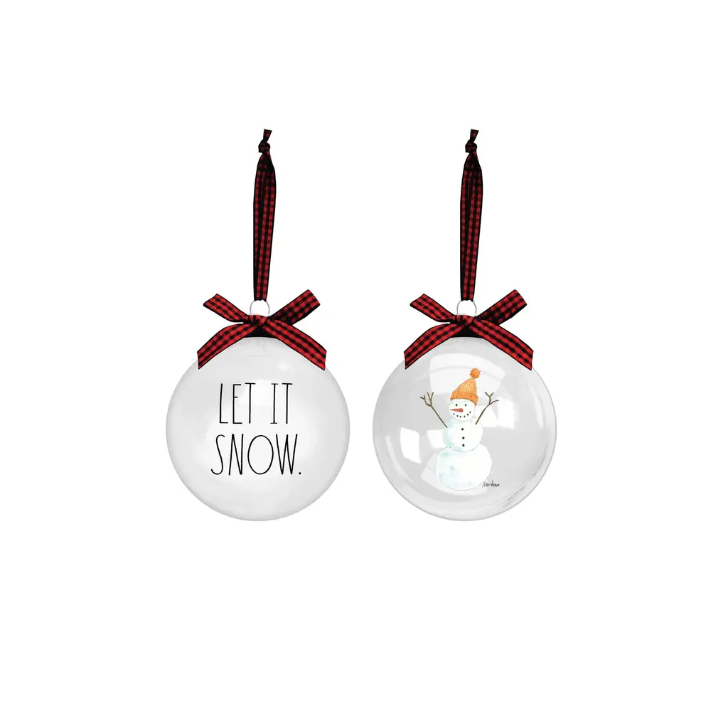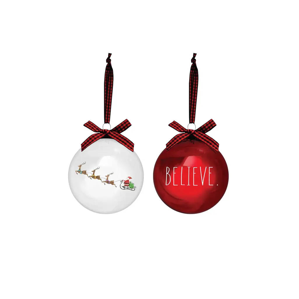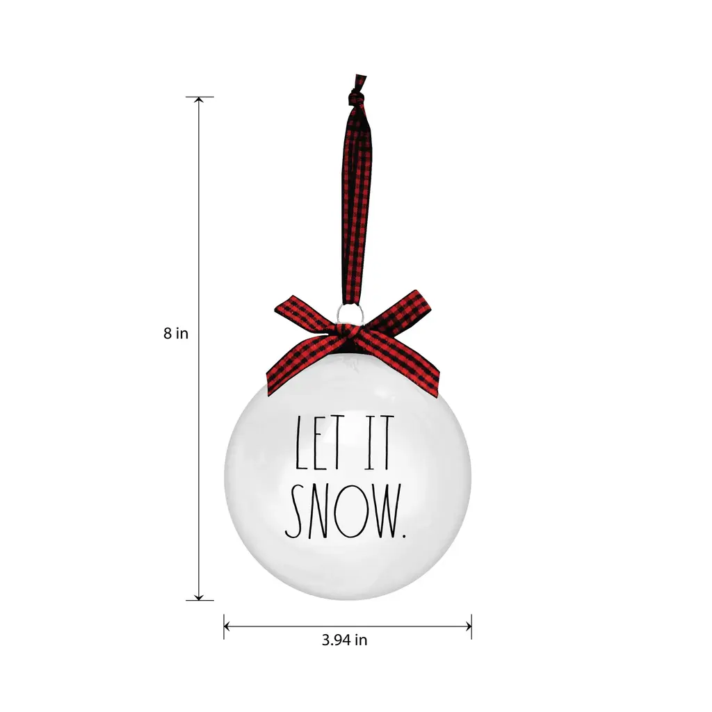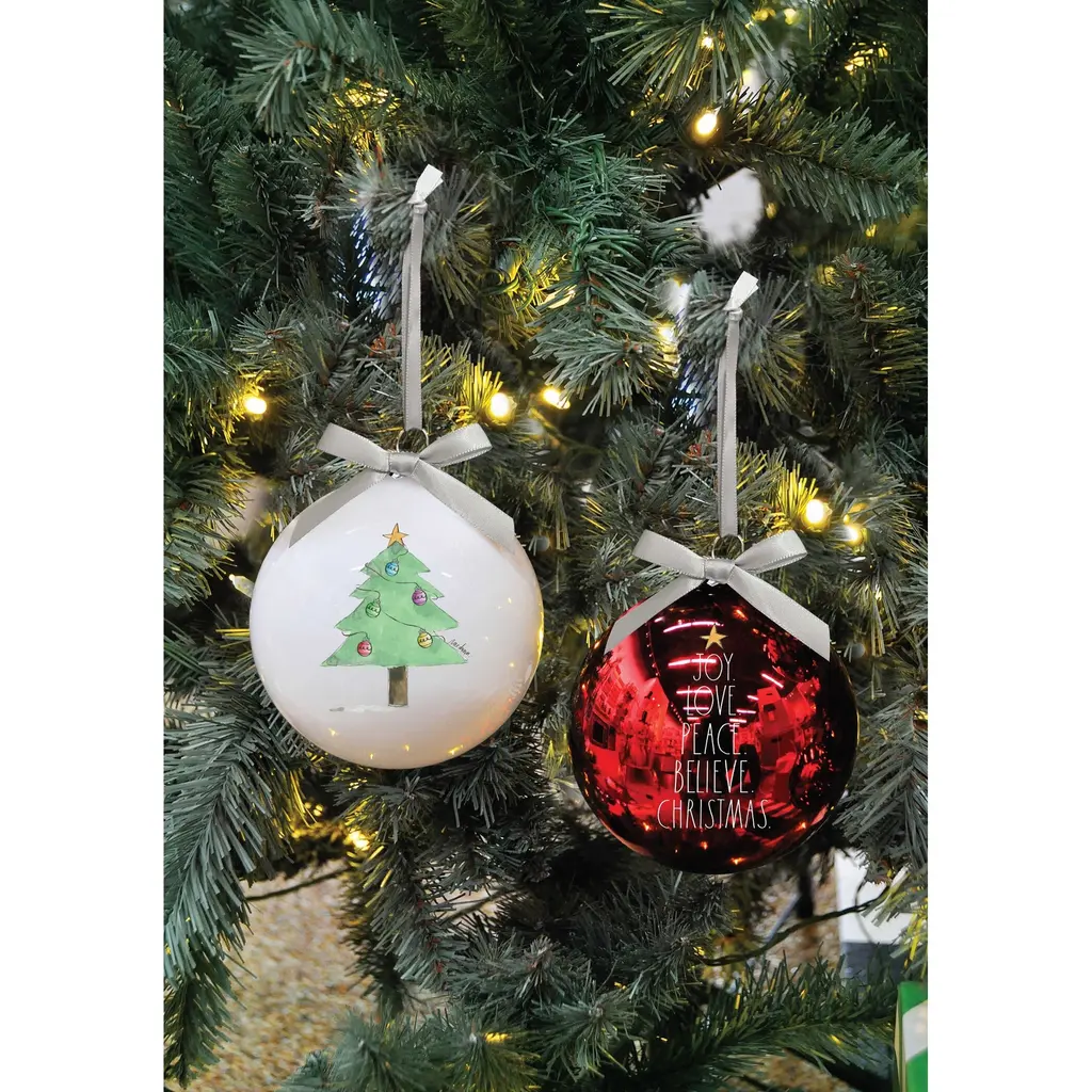 Decorate trees and spread the holiday cheer with this gorgeous Set of 3 Glass Christmas Ornaments by Rae Dunn! These beautiful glass ornaments feature words of the Season in Rae Dunn’s signature font. Upgrade last year’s decorations with stunning new ornaments nice enough for Santa himself.PRODUCT FEATURES:100mm (3.94”) Diameter SizeSeamless Ornamental GlassMetal Hanging HooksDecorative Red RibbonsDECORATE YOUR TREE IN STYLE‘Tis the season to be jolly! Begin this year’s festivities by decorating the tree with these exquisite glass ornaments. With beautiful color definition and incredible luster, these decorations will last brilliantly for many seasons to come. Hang them on trees, wreaths or use for Xmas crafting projects. Deck the halls of houses, apartments, schools, office buildings and retail stores with these Fa-La-La-La-Lovely ornaments!Here’s Rae Dunn wishing you a Merry Christmas… and a Happy New Year!RAE DUNNCalifornia artist, ceramicist and author, Rae Dunn, finds beauty in simple shapes, imperfection and found objects. "In my own way, I am driven to find the balance between expressing something that is deeply meaningful to me and creating a sense of joy that might quietly touch the lives of others."Rae's designs are known for their functionality, design, and durability. Rae's signature font gives every item a personal touch and adds to the simple beauty of her designs.