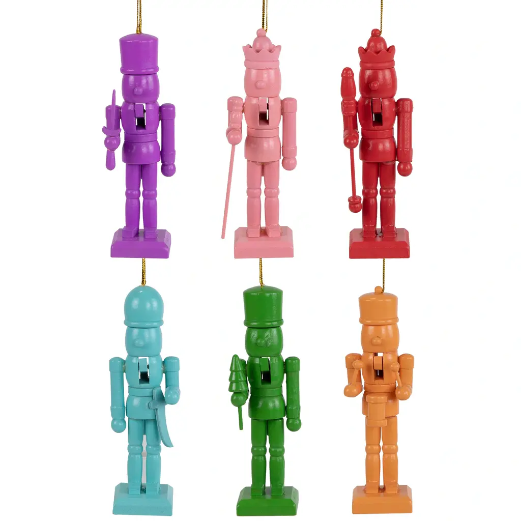 Add some festive cheer to your holiday decor with these nutcracker Christmas tree ornaments. These ornaments come in a set of 6 and feature nutcrackers in vibrant purple pink sky blue red green and orange hues. Each ornament comes ready to hang on a gold cord but also includes a sturdy square base making it easy to display them on mantles or tabletops. Product Features: Set of 6 nutcracker Christmas ornaments Set includes nutcrackers in solid purple pink sky blue red green and orange hues Each nutcracker ornament includes a working back lever that opens and closes the mouth Fully dimensional ornaments Come ready-to-hang on gold cords The perfect gift for nutcracker collectors Each ornament includes a durable square base perfect for displaying on tabletops Recommended for indoor use only Dimensions: 5"H x 1.75"W x 1.5"D Material(s): wood