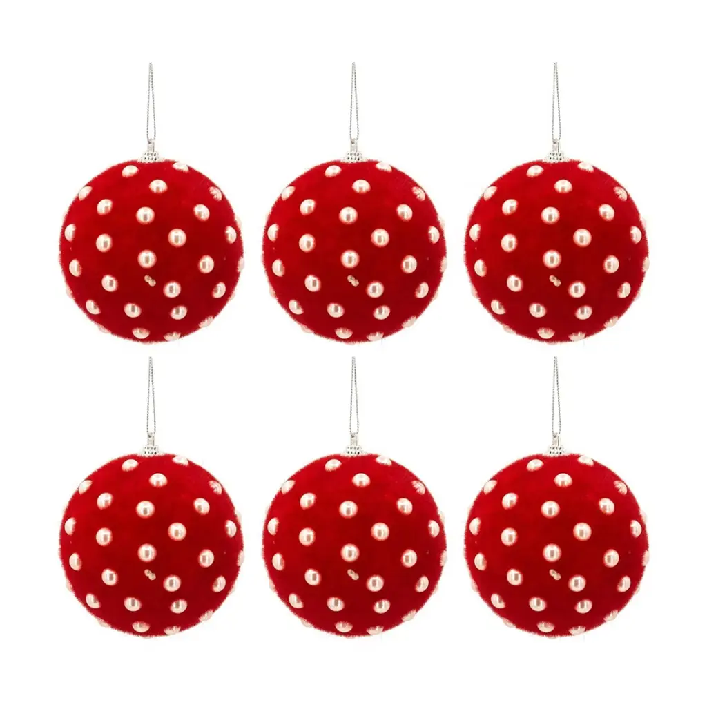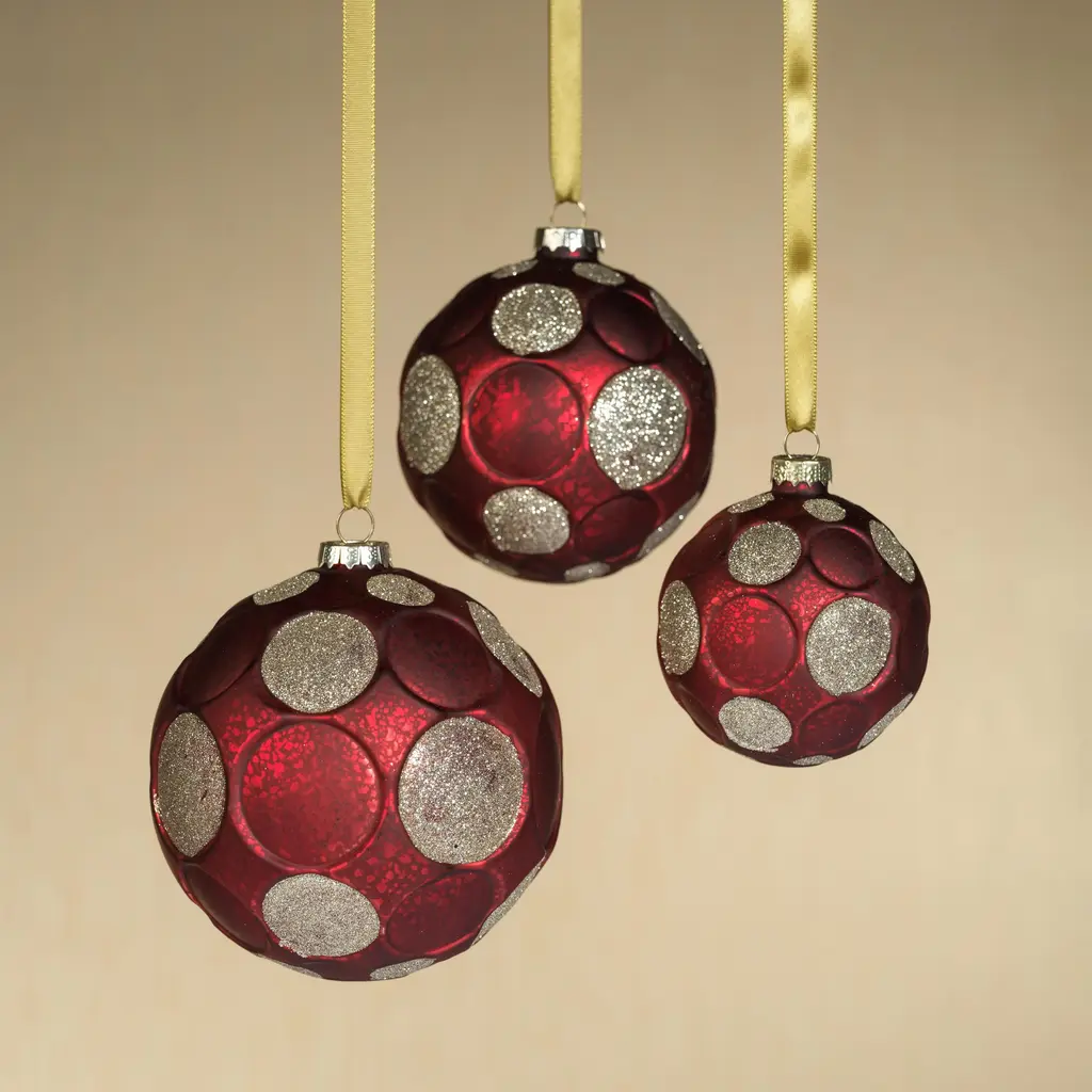 Add a touch of whimsy and elegance to your holiday decor with the Matte Frosted Serenity Glass Ball Ornaments. These enchanting ornaments are crafted to resemble speckled glass and feature a delightful polka dot design, where some dots boast a chic matte frosted finish while others sparkle with glitter. This captivating contrast creates a playful yet sophisticated look that adds depth and interest to your festive decorations. Perfect for adorning your Christmas tree or garland, these ornaments bring a unique blend of charm and glamour to your seasonal celebrations. Fun polka dot pattern. Set of 6 hanging ornaments of the same size. Matte frosted finish with glitters. Equipped with ornament cap A fun and festive addition to any holiday décor. Comes ready to hang. Clean with a soft dry cloth.