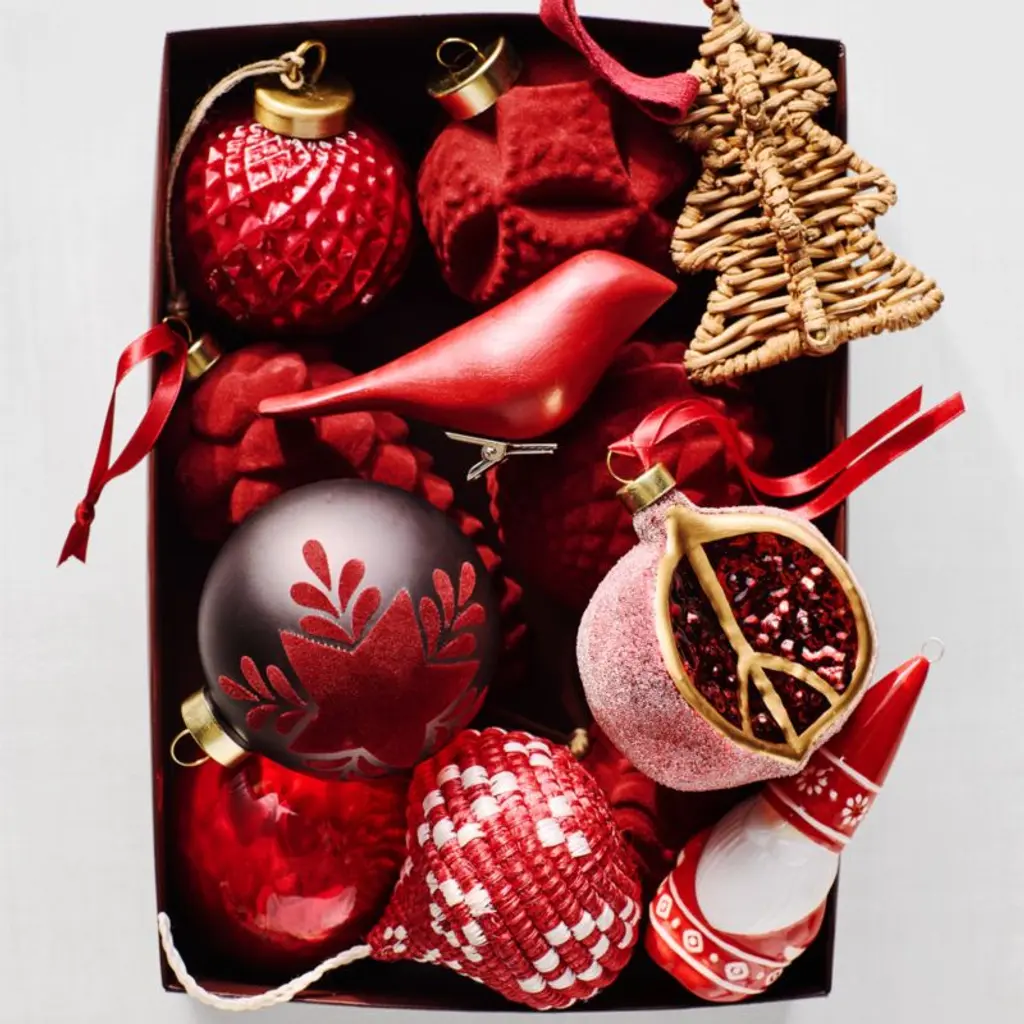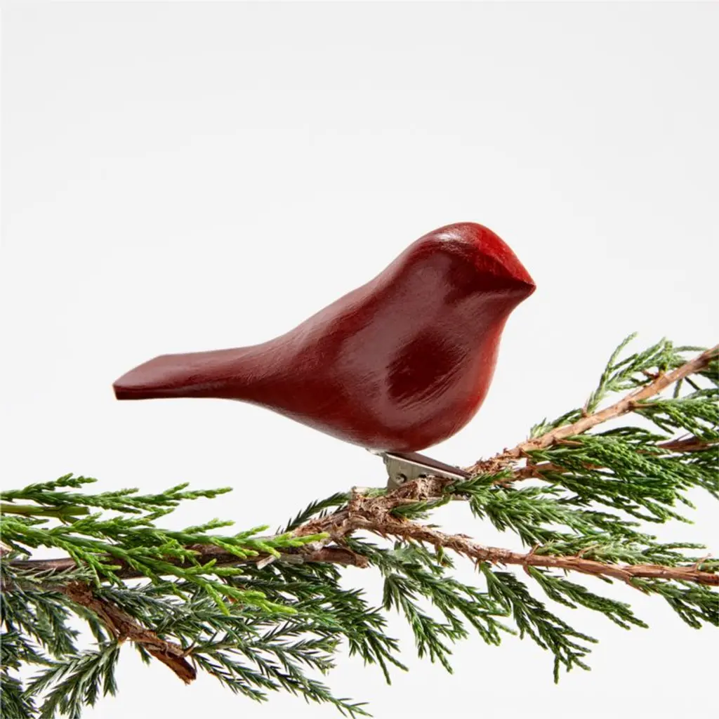 Our ruby-red bird Christmas tree ornament brings the natural beauty of winter to your Christmas tree. Carved with simplified curves and streamlined style, the red wood Christmas tree ornament perches comfortably among the evergreen boughs thanks to its metal clip. Our wood bird Christmas tree ornament clip is a Crate & Barrel exclusive.