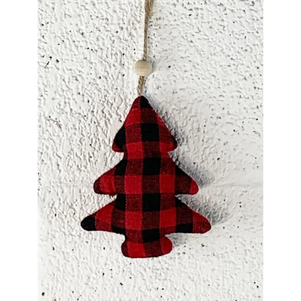 Description:Christmas Tree Ornament is a plush tree shaped ornament with a red, black, and gray plaid pattern. Tree has a string for hanging display and a white wooden base for detail and the option of freestanding display. Specification: