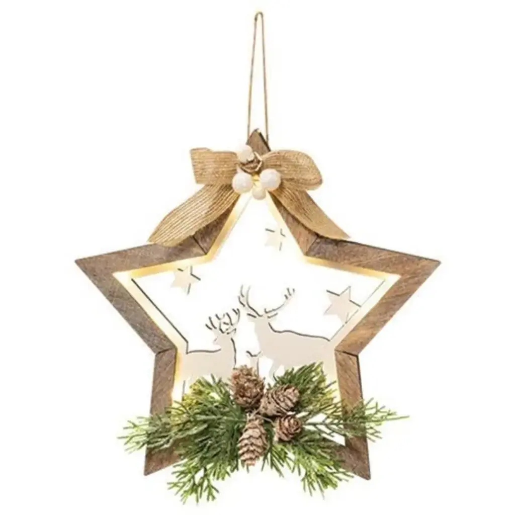 The Reindeer Cutout Ornament is a decorative hanging Christmastime ornament with a round wooden frame. The ornament is overlaid with a white wooden silhouette cutout of a trio of reindeer, complete with a bundle of pine greenery and pinecones at the bottom. The top of the ornament is accented with a burlap bow and white mistletoe berries, as well as a jute rope loop for hanging. Features