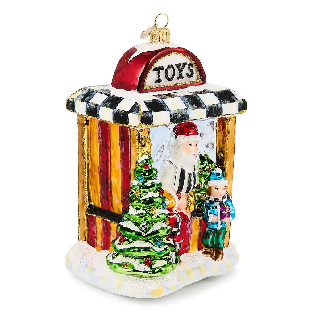 Celebrate the magic of the season with the Santa's Toy Store Glass Ornament. This whimsical ornament depicts Santa at the window of his toy store, hand-painted with sweet details and a colorful design that brings holiday joy. The stunning collectible comes with an authentic brass logo charm, making it a wonderful gift or addition to your own Christmas tree.