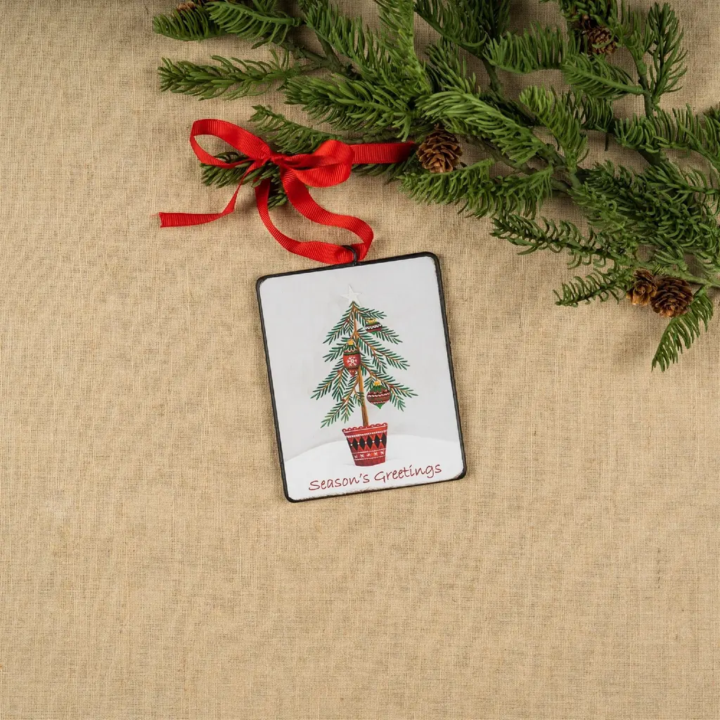 Elevate the charm of your Christmas tree with our delightful pine tree ornaments. Each ornament showcases a sentiment and features a lovely potted pine tree design adorned with Nordic patterned accents. The delicate ribbon tie hanger ensures easy placement and adds a touch of elegance to your tree. Whether you're sprucing up your own home or sharing the joy with a loved one, these ornaments are sure to bring smiles and a festive atmosphere to your holiday celebrations. Product Features: 12-piece set Potted pine tree design Accented with Nordic pattern Sentiments printed on both sides of the ornaments Ornament reads "Seasons Greetings" Comes with a ribbon tie for easy hanging Perfect addition to your holiday tree decoration For indoor use only Dimensions: 5.5"H x 4.5"W x 0.25"D Material(s): iron/polyester