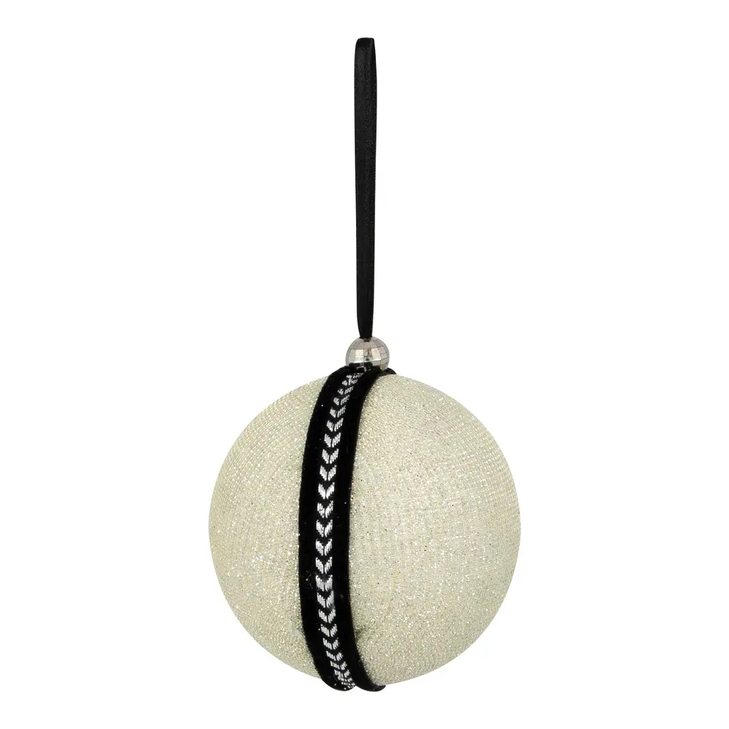 Add texture to your winter and Christmas decor with these glitter sequined and striped ornaments. They will also provide the sparkle you crave for your holiday decor. Hang from Christmas trees and mantles or give as a gift. Features: Round hanging ornament ball Multiple textures and striped design Accented with glitter and sequins throughout Designed with a black ribbon with glitter accents Recommended for indoor use Dimensions: 2.75" diameter Material(s): foam/glitter/sequins