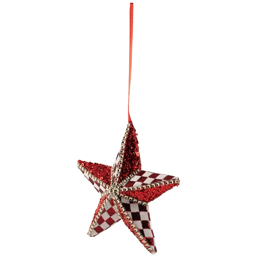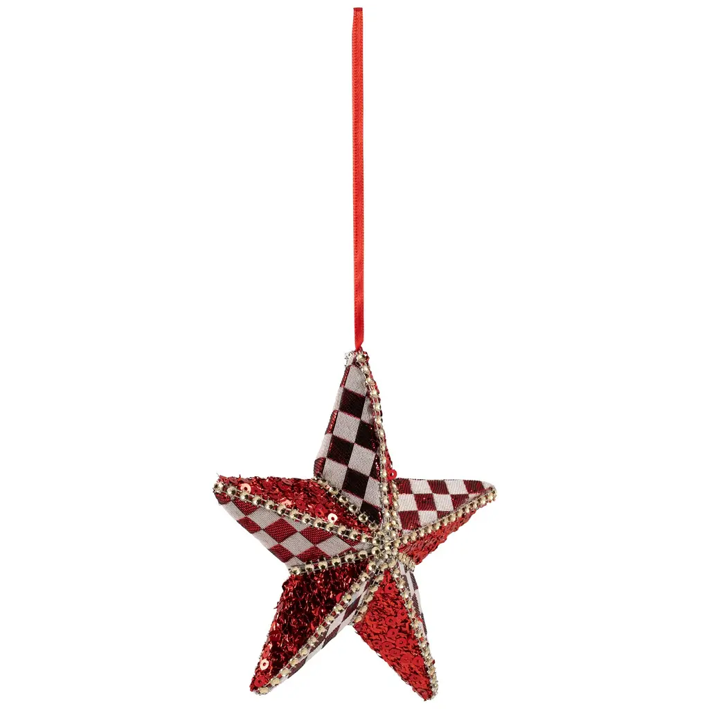 Add a touch of glamour to your holiday traditions with this dazzling ornament. This exquisite double-sided ornament has a stunning 5-point star design. Adorned with vibrant red sequins and white checkered pattern, it exudes elegance and charm. Hang it effortlessly on your tree with the included red ribbon and let its radiant beauty sparkle throughout the festive season. Product Features: Christmas hanging ornament 5-point star adorned with red sequins and metallic red and white checkered patterns Accented with shimmering gold ribbon Double-sided ornament Comes ready-to-hang on a red ribbon Recommended for indoor use only Dimensions: 6"H x 6"W x 2"D Material(s): fabric/sequins