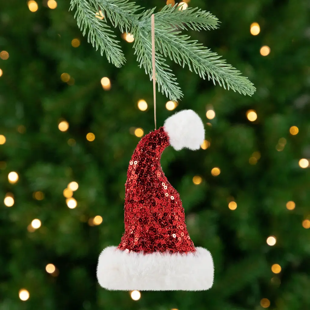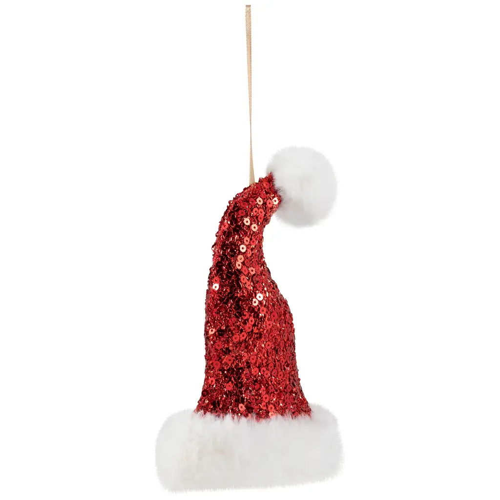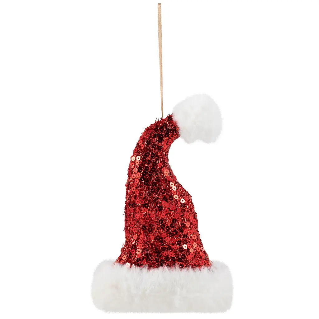 Elevate your seasonal displays with this elegant ornament ideal for adding a dash of sparkle to your home this holiday season. This stunning ornament features a classic red and white Santa hat design adorned with shimmering red sequins and plush white trim. Its double-sided construction ensures it looks perfect from any angle while the attached white ribbon makes it easy to hang on your Christmas tree wreath or anywhere you desire. Product Features: Christmas hanging ornament Red Santa hat design embellished with red sequins Accented with soft plush white trim and a pom-pom Double-sided ornament Comes ready-to-hang on a gold ribbon Recommended for indoor use only Dimensions: 8.5"H x 5.5"W x 1.5"D Material(s): fabric/sequins