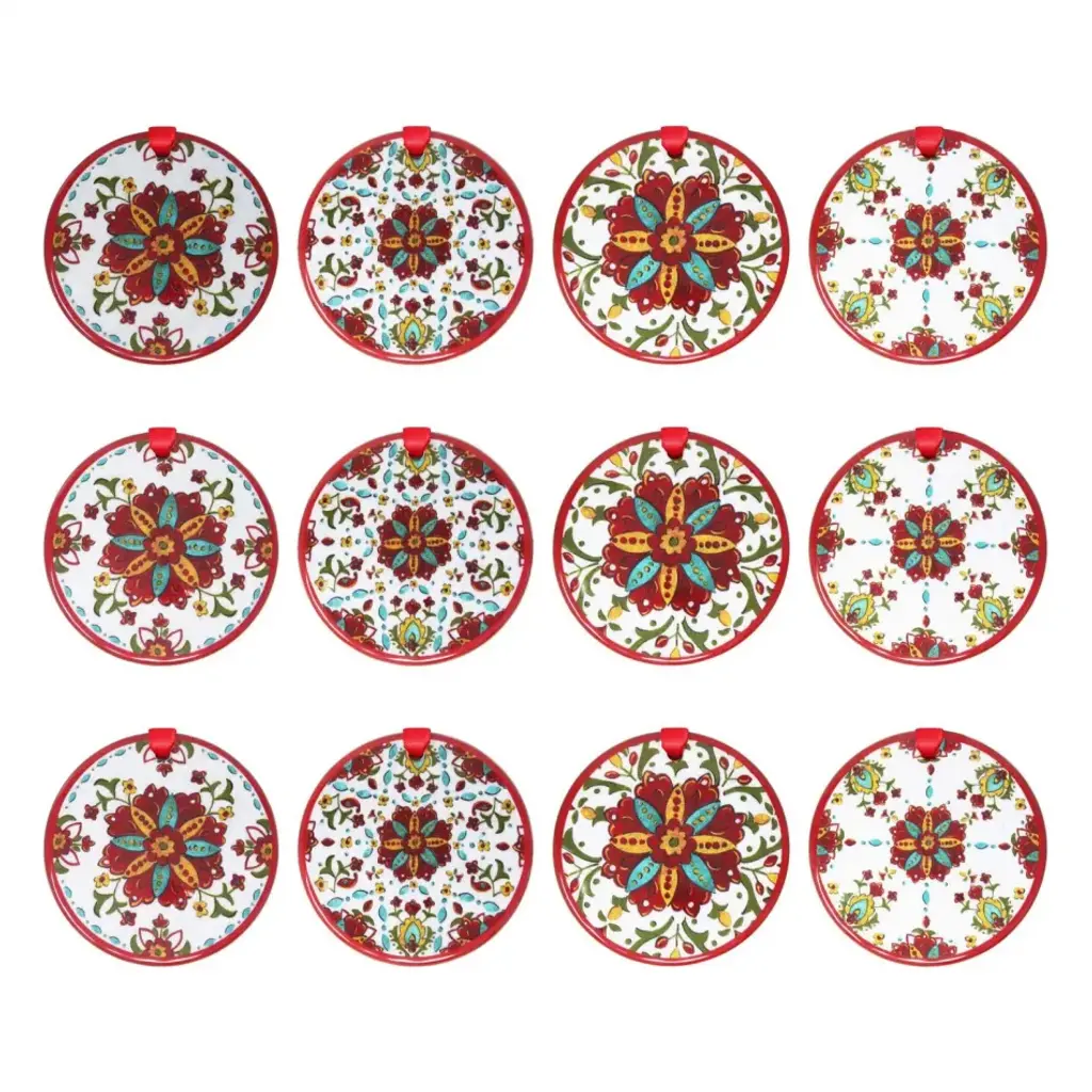 Our Christmas design disk shaped ornaments with satin ribbon to hang are in shatter resistant melamine so we’ve eliminated the fear of breakage if the tree tips over! Pretty and practical. Set of 12 includes 1 of each design. Product includes 12 x ornaments that are 3.125" in diameter.