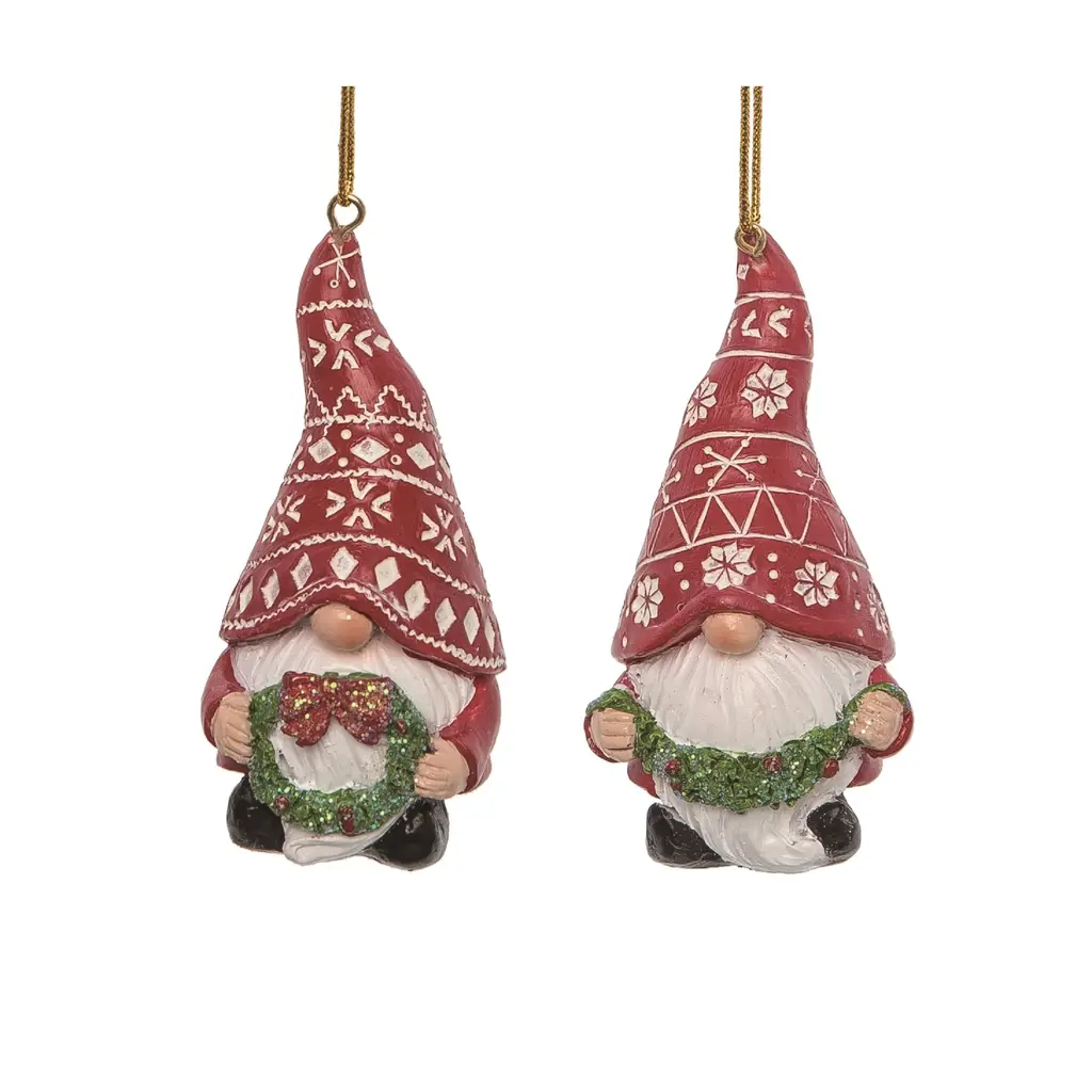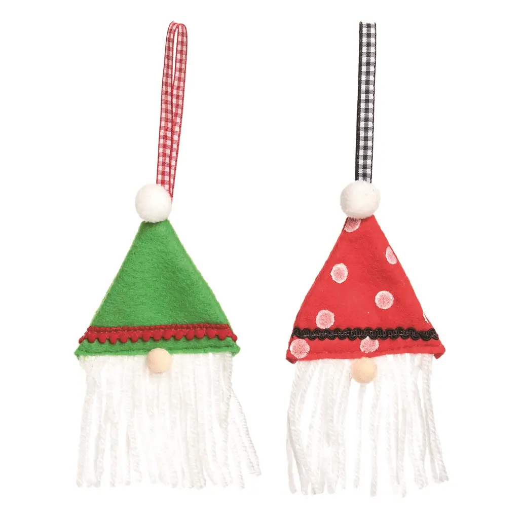 Gnomes are best known for guarding Earthly treasures and are perfect for protecting your Christmas goodies. Add a pop of color, a ton of cuteness, and luck to your holiday decor. These are just perfect for placing by your Christmas tree, a mantle, a tabletop, or anywhere you want to add that whimsical touch. Product Features: Red and gray striped gnomes Wired hats for easy shaping Weighted bottoms for stability Comes ready to hang on a white string Recommended for indoor use only Dimensions: 6.25"H x 3.75"W x 2"D Material(s): polyester/fabric/wood Note: Set of 2 includes 1 of each gnome pictured