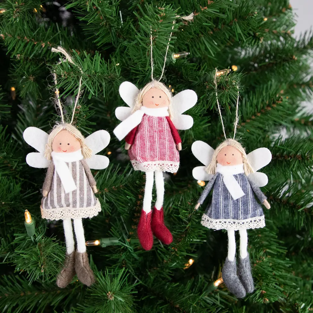 Angels represent good things and good wishes. Each wearing a striped dress with lace trim they include a white string and are ready to be hung. Perfect for your Christmas tree mantles or tabletop! Product Features: Angel doll Christmas ornaments. Wearing a striped red brown or blue dress with a white scarf. Each Angel has dangling legs with boots that match their sleeves. White Angel wings accent each doll. Includes white string attached to the hats for easy hanging. Recommended for indoor use only. Dimensions: 6"H x 3"W x 1"D. Material(s): fabric/felt. Set of 3 includes 1 of each ornament shown