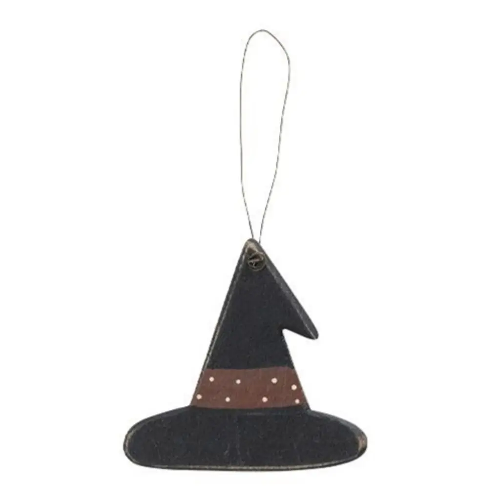 Specification: Description: Add a touch of rustic charm to your Halloween décor with this set of four primitive wooden ornaments. Each ornament features a unique design, including a witch hat, a ghost boy, a candy corn topped with a star, and a jack-o'-lantern. Crafted from wood, these ornaments are perfect for hanging and adding a festive, vintage feel to your Halloween celebrations. Each ornament is equipped with a rustic wire hanger for easy display. The witch hat measures 3" wide by 2.5" high, the ghost boy is 1.5" wide by 3" high, the candy corn is 1.5" wide by 3.25" high, and the jack-o'-lantern is 1.5" wide by 3" high, making them the ideal size for any Halloween setup.
