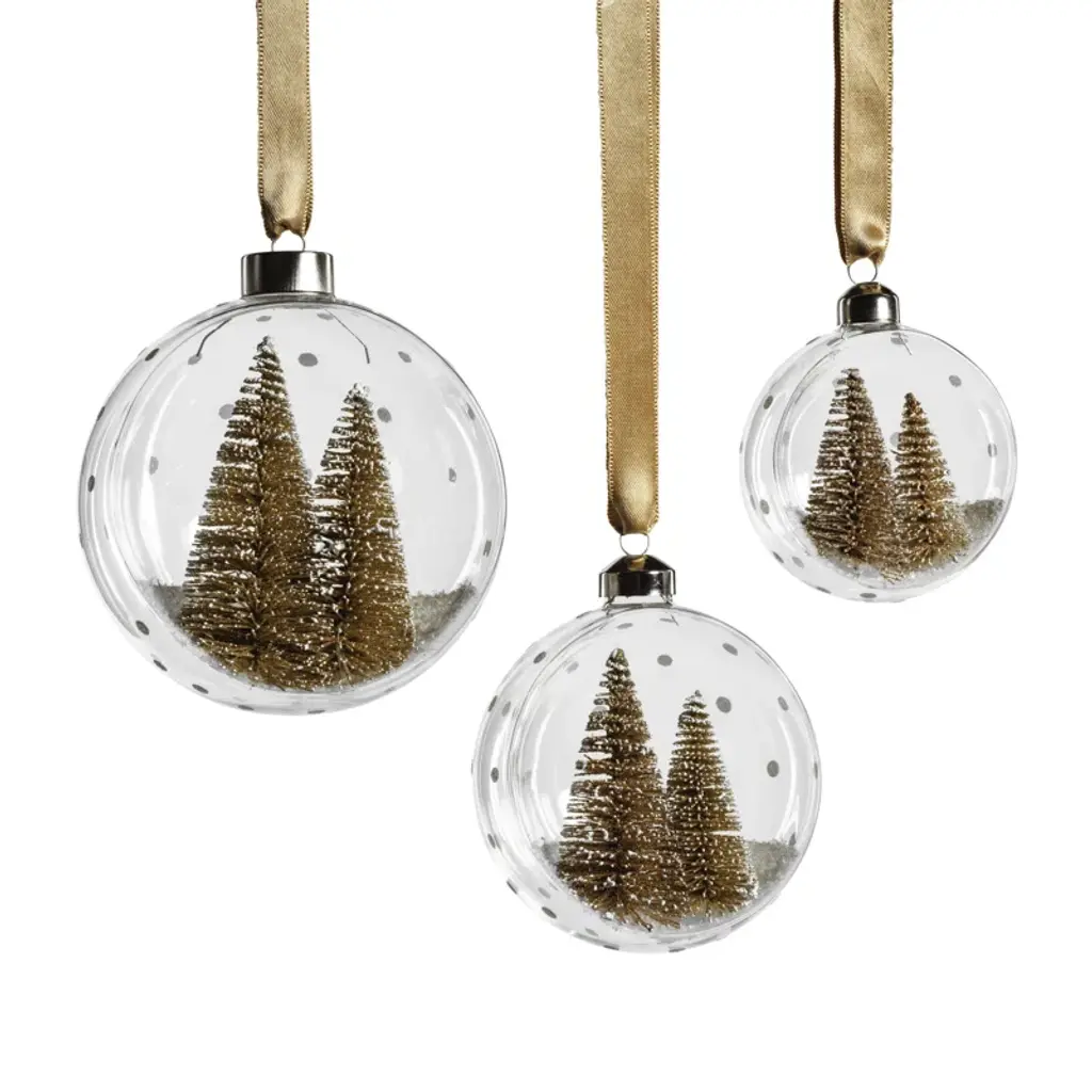 Shake up some holiday cheer! Create a holiday scene this season with this round glass ornament set featuring snow frosted wonderful trees. Adorn not just your tree and wintry displays, but also mantels and shelves. Place them in large bowls and vases to create a lovely centerpiece!