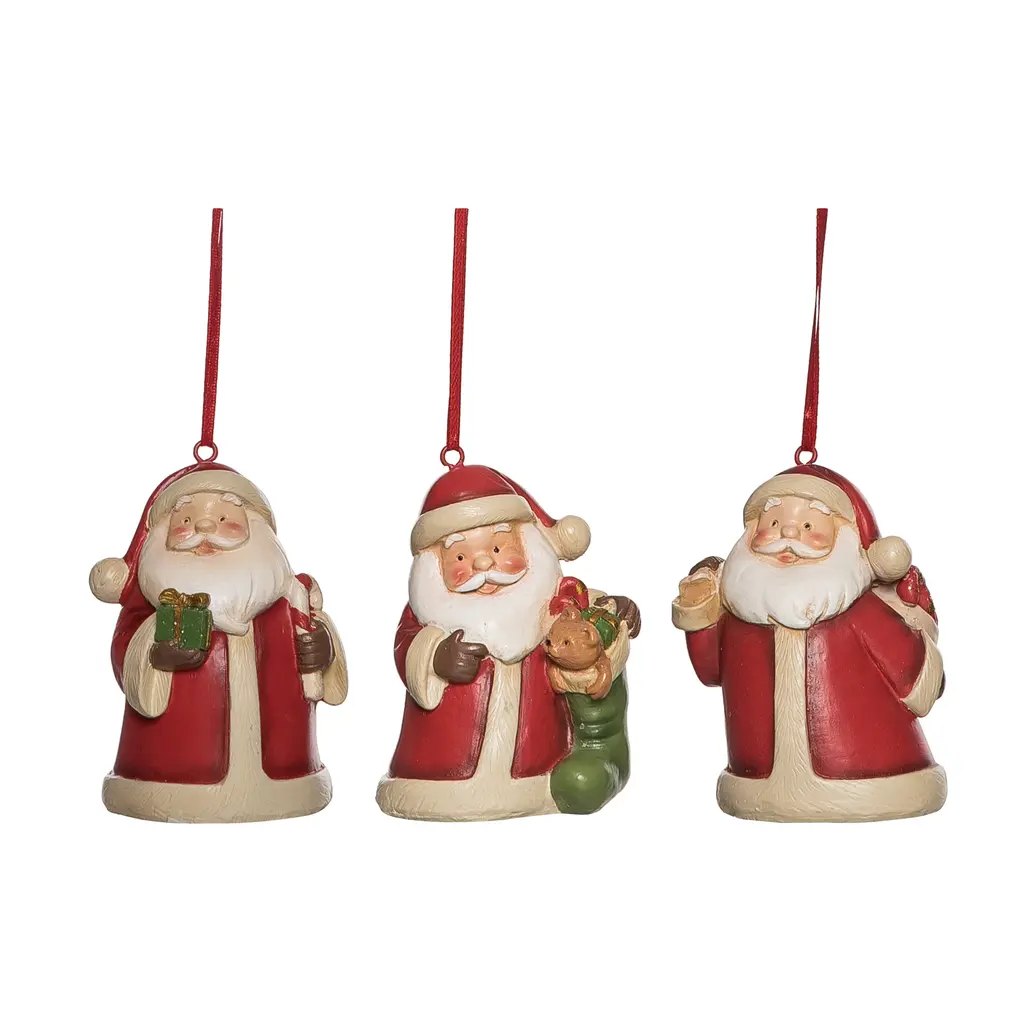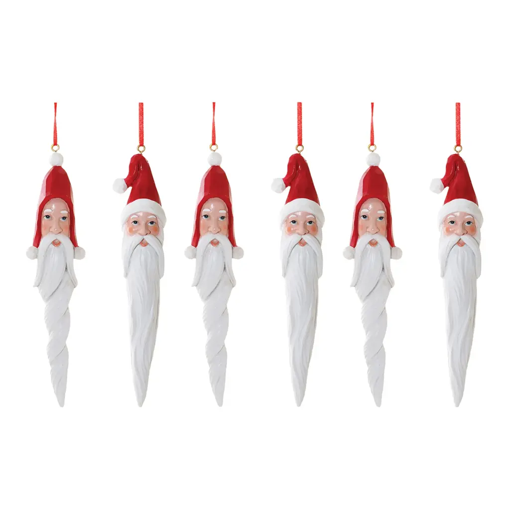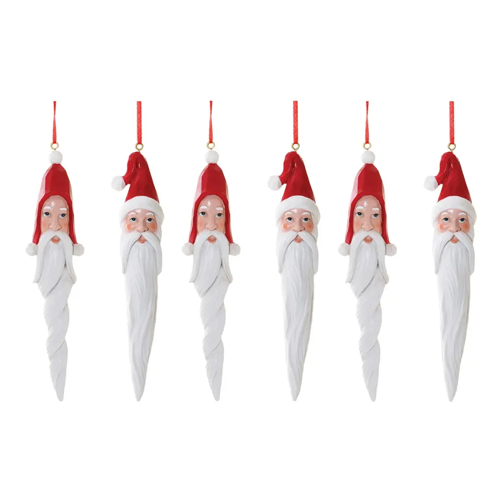 Embrace the holiday spirit with these beautiful carved Santa drop ornaments, adding a rustic touch to your Christmas tree. Featuring finely carved Santa designs and ruddy red cheek accents, they create a memorable display. Whether adorning your home or gifting to loved ones, these ornaments are sure to bring smiles. Elevate your festive decor with the charm of these delightful ornaments and make this holiday season extra special. Product Features: 6-piece set Festive red and white tones Accented with ruddy red cheek and unique style beard Santa comes with long beard and braided beard Comes ready-to-hang on a delicate ribbon string hanger Perfect addition to your holiday tree decoration For indoor use only Dimensions: Santa with straight beard: 8.25"H x 2"W x 1.25"D Santa with braided beard: 8.25"H x 1.5"W x 1.25"D Material(s): polyresin/stone powder