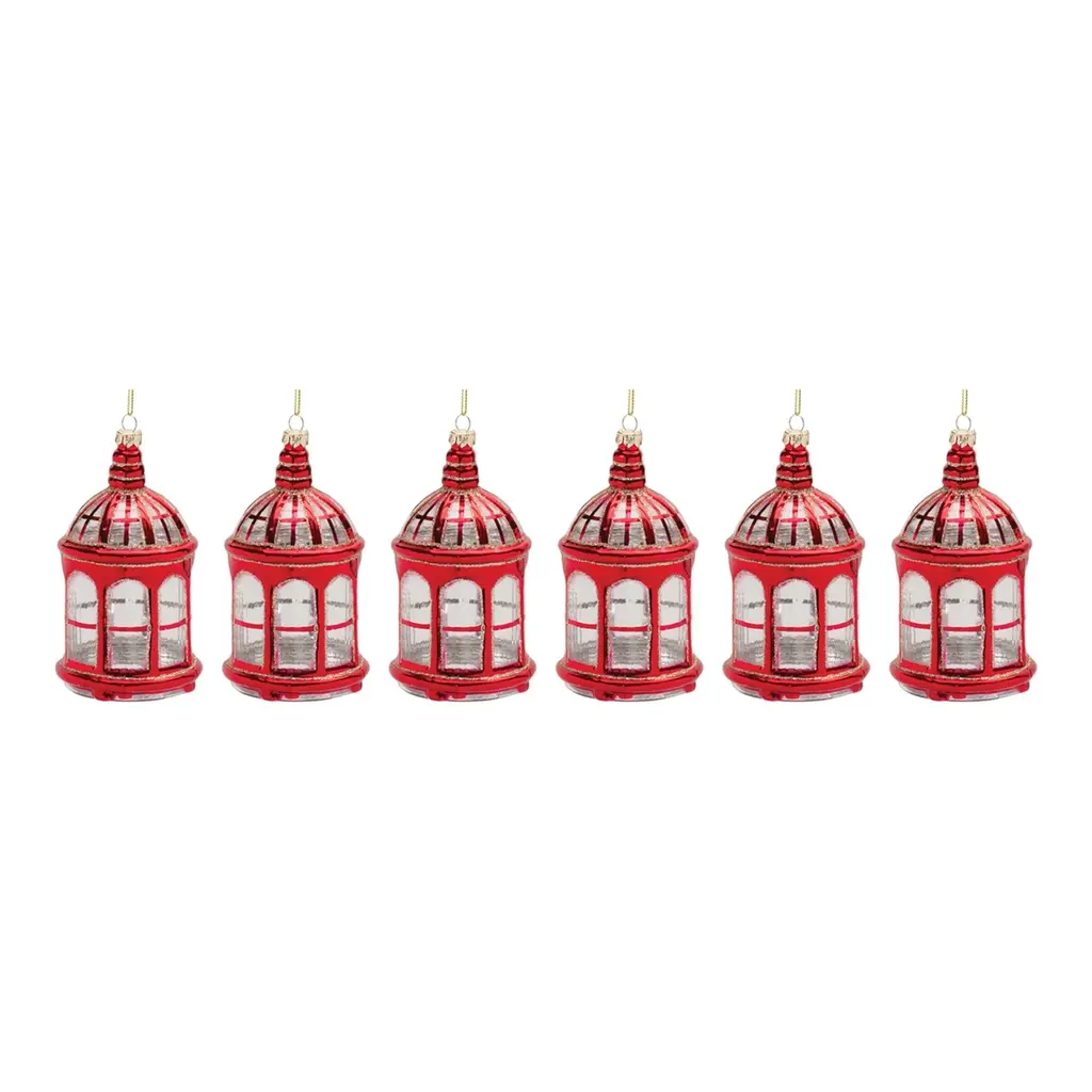Illuminate your holiday season with these ornaments. These charming antique-inspired ornaments will add a timeless touch to your Christmas tree. With festive red tones and delicate gold glittered accents, these lantern-shaped ornaments create a memorable and elegant display. Whether adorning your own home or spreading cheer to loved ones through gifting, these ornaments are sure to bring smiles and warmth to your holiday decor. Product Features: 6-piece set Color: festive red and gold Antique lantern design Accented with gold glitter Come ready-to-hang on a gold string Equipped with a gold ornament cap For indoor use only Perfect addition to your Christmas tree decoration Dimensions: 5.5"H x 3"W x 3"D Material(s): glass