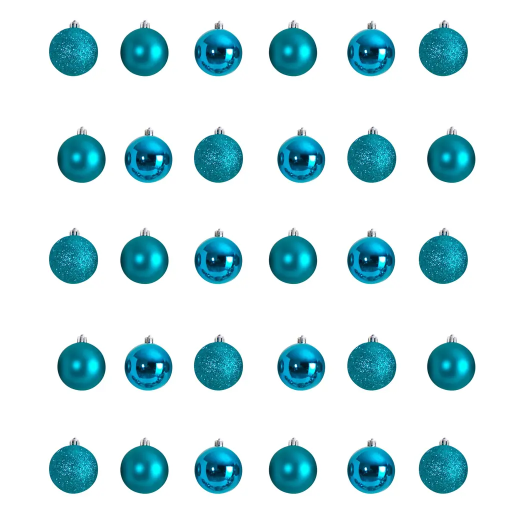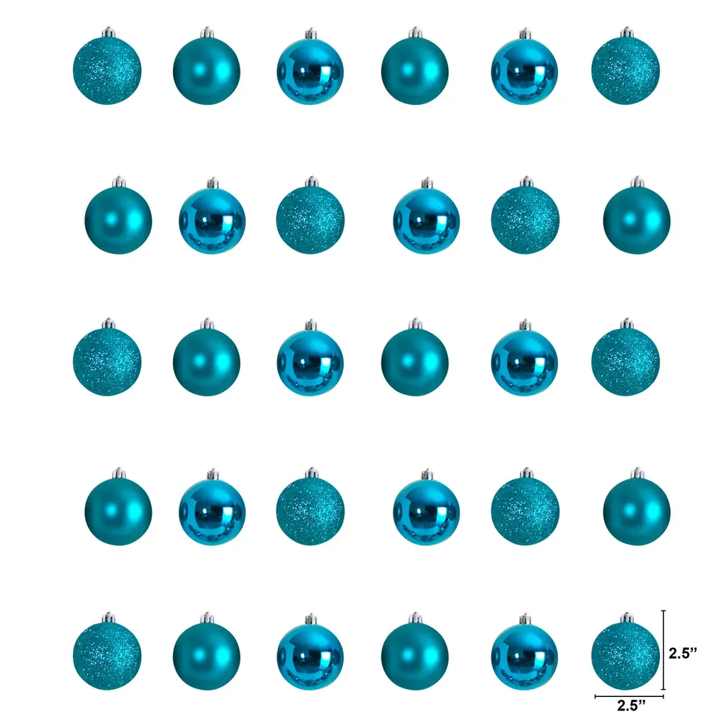 Bring some festive cheer into your home with these teal shatterproof Christmas ball ornaments. Great for filling gaps and coordinating color themes, these ornaments add a touch of luster and vibrancy to your tree. Made from durable, shatterproof material, they mimic the beauty of glass without the risk of breakage, and are packaged in a practical reusable tube for safekeeping and future use. Product Features: 30-piece set Color: teal Comes in 3 finishes: shiny, matte, glitter drenched Great for combining with other ornaments It comes in a reusable tube for easy storage Balls are equipped with silver ornament caps Recommended for indoor use only Care instructions: wipe clean with a soft dry cloth Dimensions: 2.5" diameter (60mm) Material(s): plastic/glitter Note:Set of 30 includes 3 of each ornaments shown