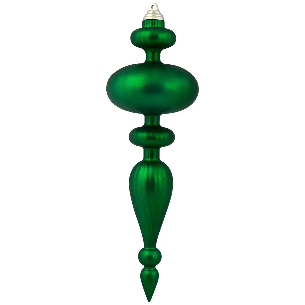 Add a touch of elegance to your holiday décor with our commercial size shatterproof finial Christmas ornaments in classic green. This set includes two ornaments with a matte finish and two with a shiny finish providing versatility to suit any decorating style. These ornaments are shatterproof making them perfect for both indoor and outdoor displays. Elevate your Christmas tree or adorn wreaths and garlands with these timeless ornaments sure to add a festive flair to your seasonal celebrations for years to come. Product Features: 4ct green Christmas finial ornaments Set includes 2 matte and 2 shiny ornaments Commercial size with a textured finish Large enough to decorate a large or commercial-size trees Can be used as a standalone Christmas hanging decoration Equipped with gold ornament caps and hanging cords For indoor use - if using outdoors place under a covered area Dimensions: 14" high x 4" diameter Material(s): plastic Note: Set includes 4 of the item shown; for a total of 4 ornaments