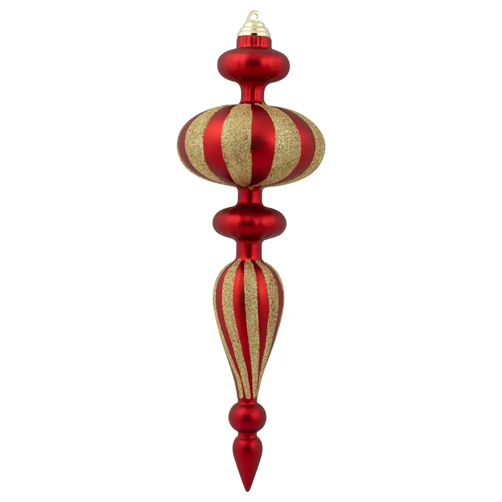 Deck your halls with elegance and durability this holiday season with our commercial-size shatterproof finial Christmas ornaments. Adorned in classic red and gold hues, each ornament features exquisite gold glittered stripes for a touch of sparkle. With a combination of two matte and two shiny finishes, these ornaments offer versatility to any holiday display. Whether hung on trees, wreaths, or garlands, these ornaments are sure to add timeless charm to your holiday décor while providing peace of mind with their shatterproof design. Product Features: 4ct red and gold Christmas finial ornaments Gold glittered stripe design Set includes 2 matte and 2 shiny ornaments Commercial size with a textured finish Large enough to decorate a large or commercial-size trees Can be used as a standalone Christmas hanging decoration Equipped with gold ornament caps and hanging cords For indoor use - if using outdoors place under a covered area Dimensions: 14" high x 4" diameter Material(s): plastic Note: Set includes 4 of the item shown; for a total of 4 ornaments